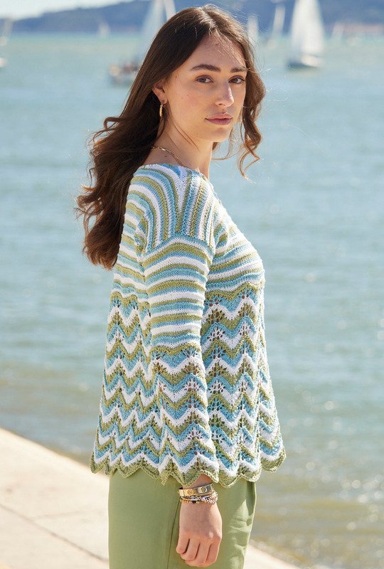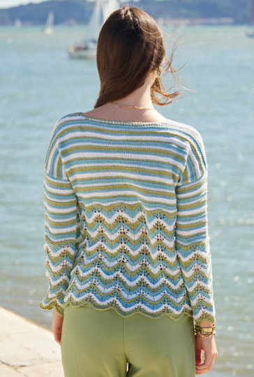 Streifen müssen nicht immer gerade verlaufen. Bestes Beispiel dafür ist dieser Pulli, dessen Streifen im unteren Teil wellenförmig und oben gerade sind. Das einfache Wellenmuster hat zusätzlich ein kleines Ajourmuster in den "Kurven". Schön frisch wirken die Farben in Zartgrün, Weiß und Türkis. Der Halsausschnitt bekommt einen sauberen Abschluss durch angehäkelte Kettmaschen. Der Name des Garns "Sommerseide" sagt es bereits: Die Mischung aus Seide und Baumwolle ist ideal für den Sommer. Eine Anleitung gibt es in den Größen 36/38, 40/42 und 44/46.