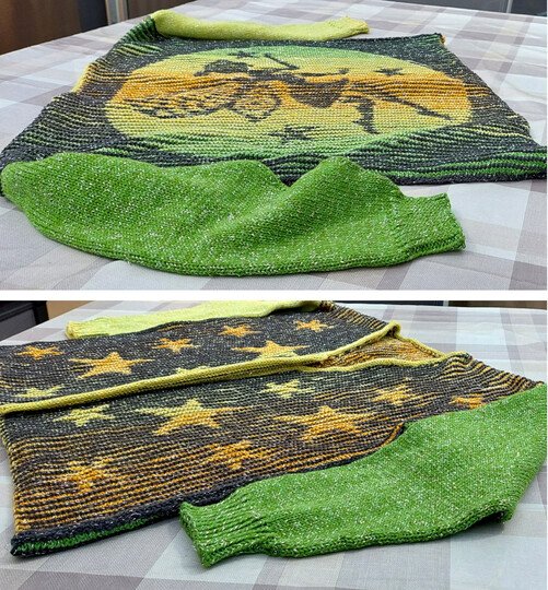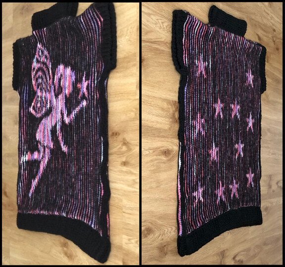 Es sind zwei Varianten. Einmal für eine kleinere Elfenjacke ohne Mond und einmal für eine größere Elfenjacke mit Mond.