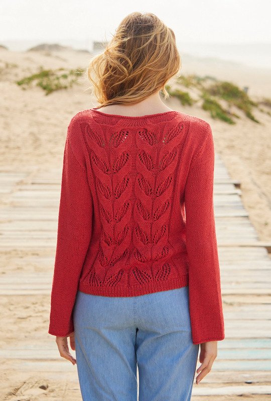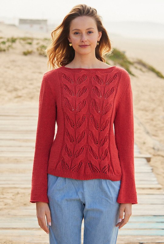 Der feuerrote Pullover aus Viskose-Baumwolle-Leinen-Gemisch steht nicht nur wegen seiner starken Farbe im Mittelpunkt der Aufmerksamkeit. Die modisch-lässigen Trompetenärmel und das markante Zopf-Lochmuster unterstreichen zusätzlich seinen extrovertierten Charakter. Begleitet wird das breite Zopfmuster von glatt rechts gestrickten Flächen. Da die Ärmel eine Armkugel haben, sitzt dieses Modell perfekt an den Schultern. Der niedrige, runde Halsausschnitt hat eher das Aussehen eines U-Boot-Ausschnitts. Für den Bund werden Rippen gestrickt, die Ärmelränder und der Halsausschnitt haben lediglich eine links gestrickte Runde. Eine Anleitung hierfür steht für die Größen 38/40, 42/44 und 46/48 zum Download bereit.