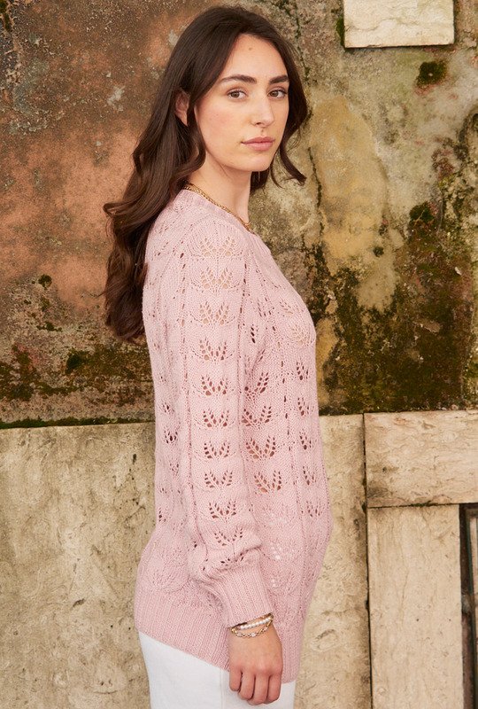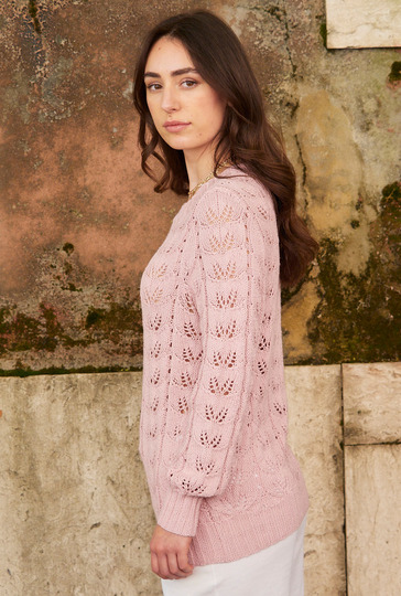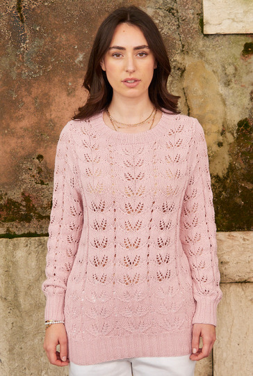 Ein Pulli so richtig zum Genießen. Mit einem opulenten Ajourmuster und aus einem besonders weichen rosafarbenen Garn aus einer Mischung von Baumwolle und Soja. Zudem ist der Pullover lang und lässig geschnitten, sodass du dich direkt beim Reinschlüpfen rundum wohlfühlen wirst. Die Bündchen sind im 2/2-Rippenmuster gearbeitet, wie auch die Blende am runden Halsausschnitt. Ärmel mit Armkugel garantieren eine perfekten Sitz der Schulterpartie. Obwohl das Garn sehr weich ist, kann es in der Waschmaschine im Schonwaschgang gewaschen werden. Die Anleitung hier kann in den Größen 38/40 und 46/48 downgeloadet werden.