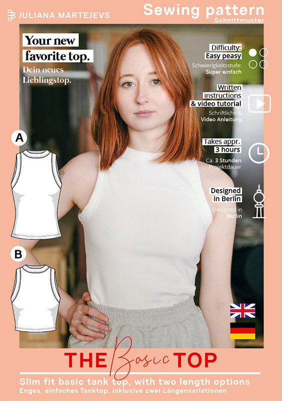 Das Schnittmuster als PDF Ebook für deine neues Tanktop "The Basic Top". Mit schriftlicher, bebilderter Nähanleitung und kostenloser Video-Anleitung auf unserem YouTube-Kanal JULIANA MARTEJEVS - Das DIY-Modelabel oder unserer Website (s. Profil).