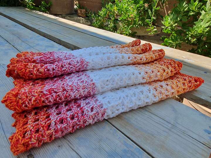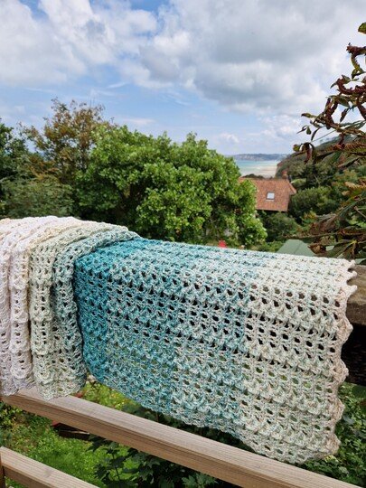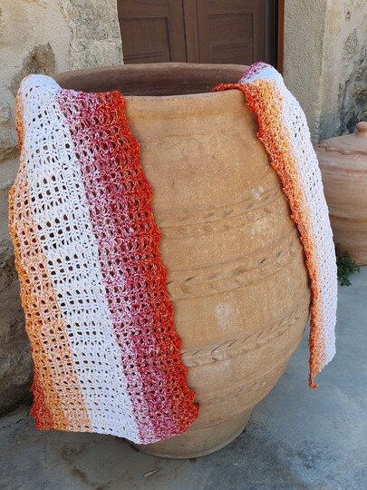 Du kannst Cool Summer mit beliebigem Garn häkeln. Bei Farbverlaufsgarn (Bobbeln) empfehle ich entweder 2 kleinere Bobbel mit jeweils mindestens 600 m 3-fädig oder 4-fädig. bzw. mindestens 1200 m Garn bei Spiegelwicklung bzw. Garn ohne Farbverlauf. Die benötigte Garnmenge ist abhängig von der gewünschten Länge und Breite des Schals, dem gewählten Material und deinem persönlichen Häkelstil.