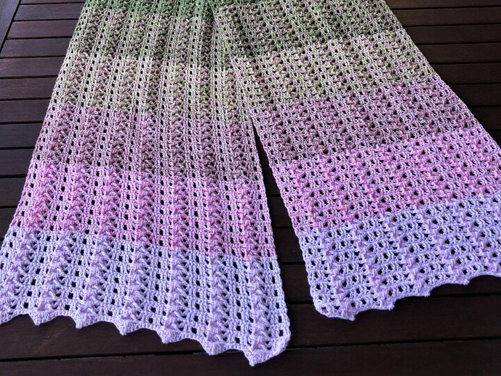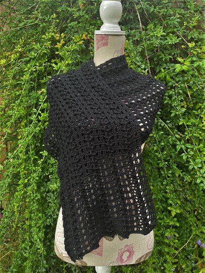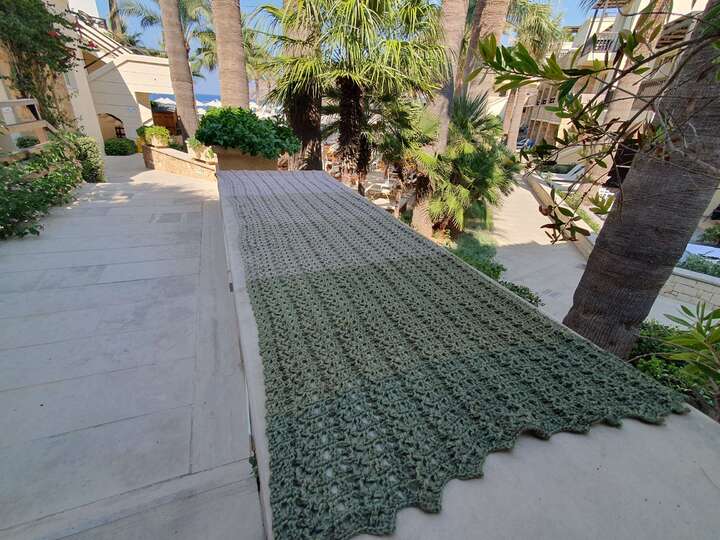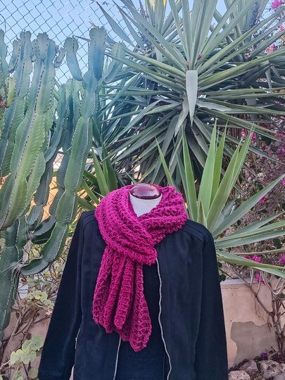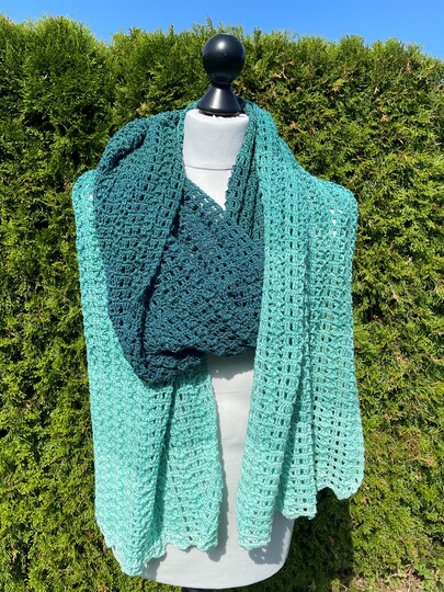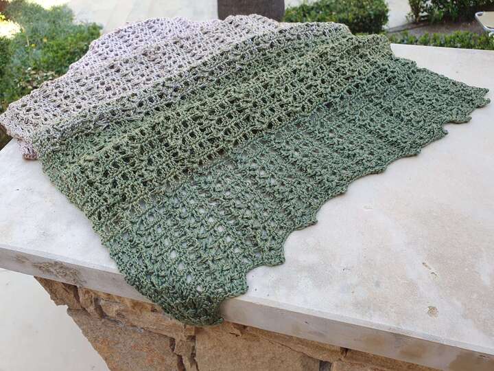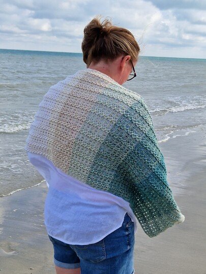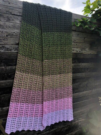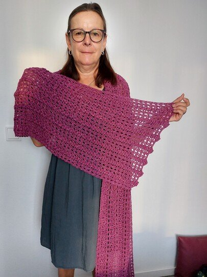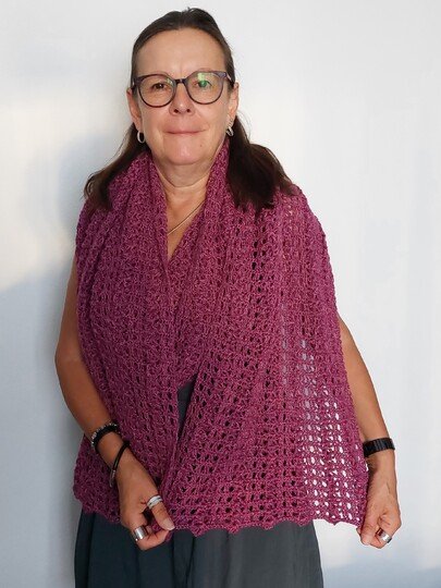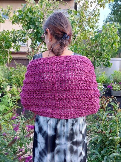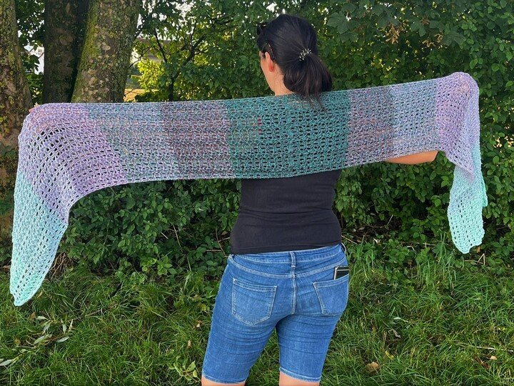 Der Schal kann in beliebiger Größe gearbeitet werden, sowohl längs, als auch quer. Wenn du den Schal breiter häkelst, kannst du ihn auch als Stola tragen.