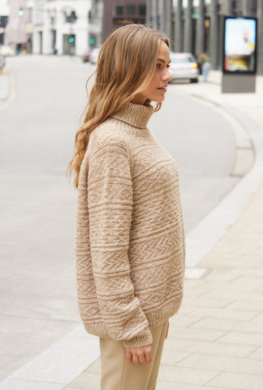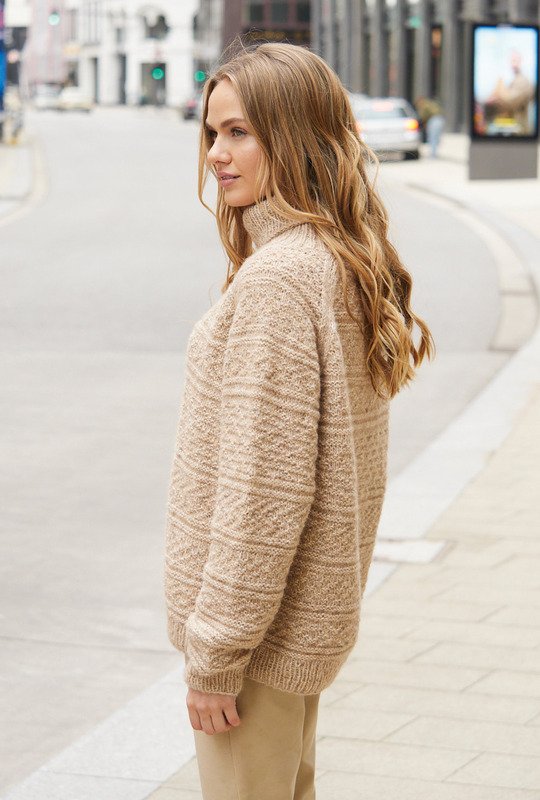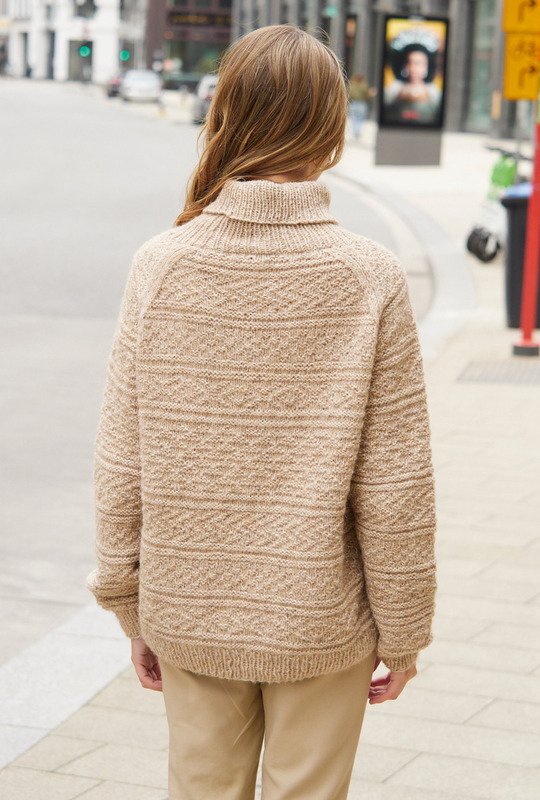 Der Raglanpulli aus flauschigem Baumwoll-Alpaka-Schurwolle-Mischgarn lebt von den abwechslungsreichen, optisch quer verlaufenden Strukturmusterstreifen. Das sieht kompliziert aus, ist es jedoch nicht, denn sie werden nur aus rechten und linken Maschen gebildet. Die Bündchen und der Rollkragen werden im 1/1-Rippenmuster gestrickt. Die Raglanlinien sind durch Glatt-rechts-Maschen betont. Der Schnitt ist lässig weit gehalten, wie es für einen so sportlichen Pullover – der durchaus auch im Büro getragen werden kann – gehört. Eine Anleitung für dieses Modell gibt es für die Größen 36/38, 40/42 und 44/46.