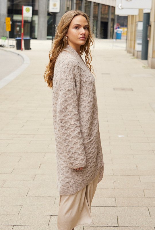 Eine lange Jacke, so kuschelig warm, dass sie gut und gerne den Mantel ersetzen kann, denn sie ist aus einem Garn aus Schurwolle und Alpaka mit etwas Polyamid-Beimischung. Gestrickt wird ein strukturbetontes wellenförmiges Zopfmuster. Die Vorderteilblende läuft als Schalkragen um den Hals weiter und ist kraus rechts gestrickt. Die Bündchen werden im 1/1-Rippenmuster gestrickt. In den zwei Eingrifftaschen finden Kleinigkeiten, wie Schlüssel und Taschentuch Platz. Eine Anleitung kann für die Größen 38 – 42, 44 – 48 und 50 – 54 downgeloadet werden.