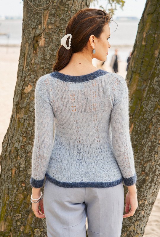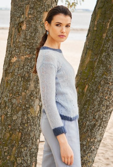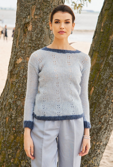 Der schmal geschnittene Ajourmuster-Pulli aus weichem Garn passt zur Alltagsjeans genauso gut wie zu einem Rock. Die in Taubenblau farblich abgesetzten Bündchen und die Ausschnittblende korrespondieren prima mit dem hellblauen Muster mit blumenartigen Löchern. Der runde Halsausschnitt zieht sich gewollt in die Breite, so dass er aussieht wie ein U-Boot-Ausschnitt. Gerade eingesetzte Ärmel erleichtern das Einnähen. Das flauschige Garn setzt sich zusammen aus Mohair, Schurwolle und Polyamid. Eine Anleitung steht in den Größen 34/36 und 38/40 sowie 42/44 zur Verfügung.