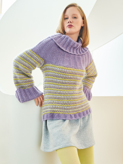 Muster aus Hebemaschen sind die ideale Technik, um verschiedene Farben schnell und easy zu verstricken. Hier als aparter Allday-Pulli mit elastischer Rippenpasse und weiten Ärmeln. Das Hebemaschenmuster ist so wirkungsvoll wie unkompliziert und in der Anleitung zudem ausführlich Reihe für Reihe beschrieben – so kann es mit Nadelstärke 5,5 zügig vorangehen. Nachdem das Rückenteil, Vorderteil und die Ärmel fertig gestrickt sind, werden alle Teile auf eine Nadel genommen und die Passe sowie der Kragen in Runden gestrickt. So geht es im Rippenmuster immer im Kreis, bis die benötigte Höhe erreicht ist. Nun werden noch die Nähte geschlossen – und fertig ist der coole Musterpulli.