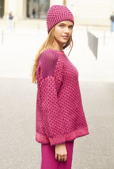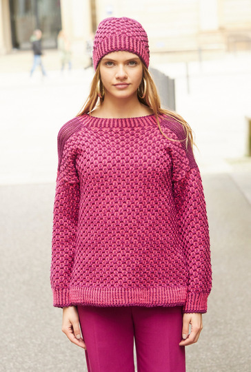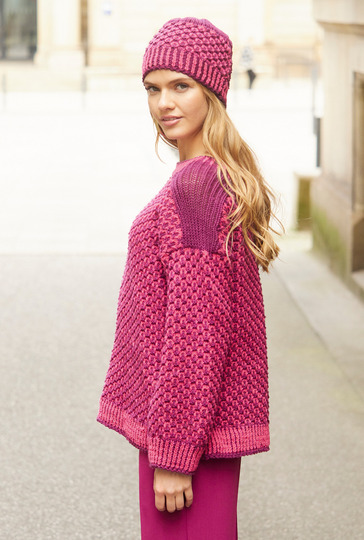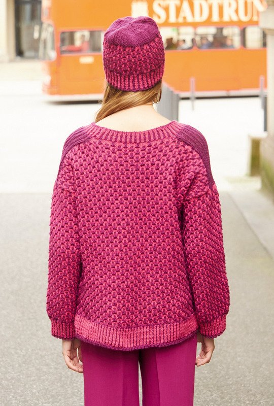 Der zweifarbige Pulli und die dazu passende Mütze sind aus reiner Schurwolle und damit angenehm wärmend. Das plastische Hebemaschenmuster setzt die beiden Farbtöne Beere (Magenta) und Pink gekonnt in Szene. Die weiten Ärmel laufen mit einer unifarbenen Schulterpasse im Rippenmuster weiter, sodass diese Partie akzentuiert betont wird. Die Bündchen und die Ausschnittblende werden im zweifarbigen Rippenmuster gestrickt. Dazu die Mütze, die ebenfalls beide Muster zeigt; sie endet mit unifarbenem Rippenmuster. Eine Anleitung ist für die Größen 38/40, 44/46 und 48/50, Mütze: 54 – 56 und 57 – 59 cm Kopfumfang bereit.