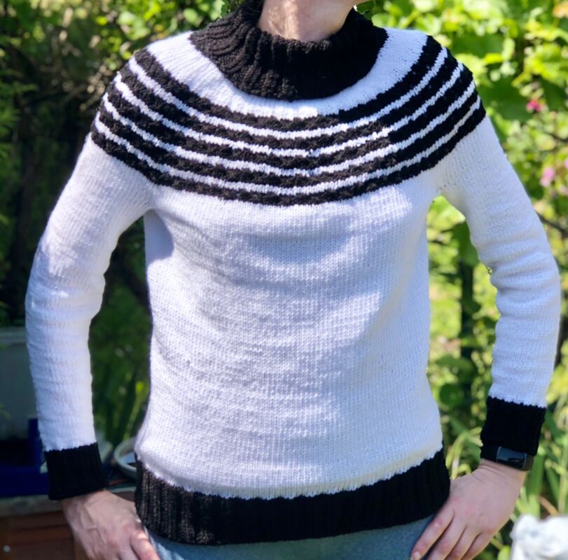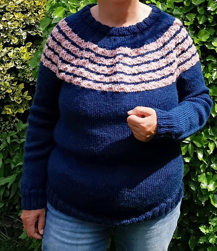 Der Rundpassenpullover Nr.2 fängt mit einem doppelten Bündchen an und wird ohne Naht in einem Stück gestrickt.