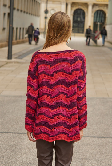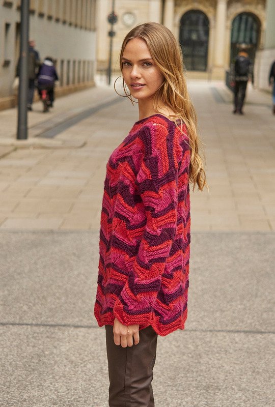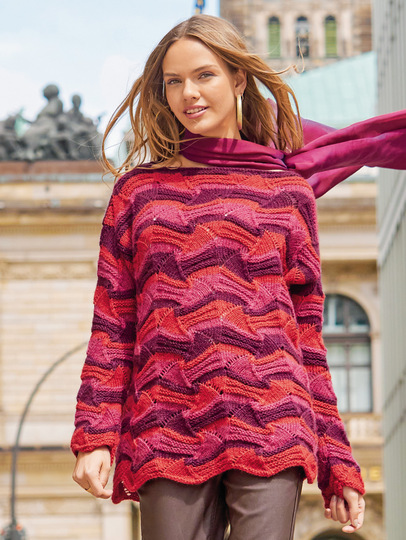 Dynamische Wellen in feurigen Farben sind der Hingucker bei diesem Pullover. Für das Wellenmuster in Rot, Fuchsia und Aubergine werden in Hin- und Rückreihen Maschen zusammengestrickt und dafür an anderer Stelle Umschläge aufgenommen. Zwei einfache Rechtecke bilden Vorder- und Rückenteil, dadurch entsteht auch der U-Bootausschnitt und die überschnittenen Schultern. Die Ärmel beginnen ganz geraden und erweitern sich für mehr Bequemlichkeit erst im oberen Bereich. Das Modell ist mit einem Mischgarn aus Alpaka, Baumwolle und Schurwolle und 5er-Nadeln gearbeitet. Bündchen sind nicht vonnöten; als sauberen Abschluss wird der Halsausschnitt mit einer Runde fester Maschen umhäkelt. Die Anleitung dazu gibt es in den Größen 38/40 und 46/48.