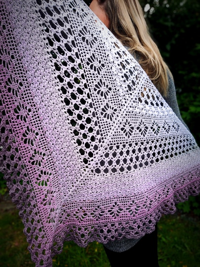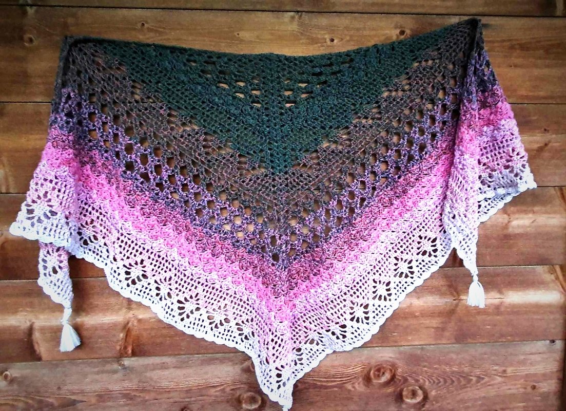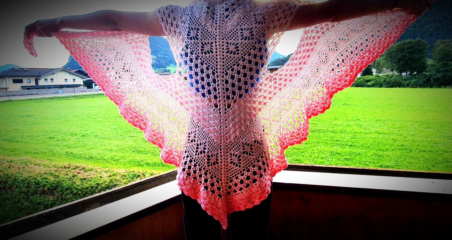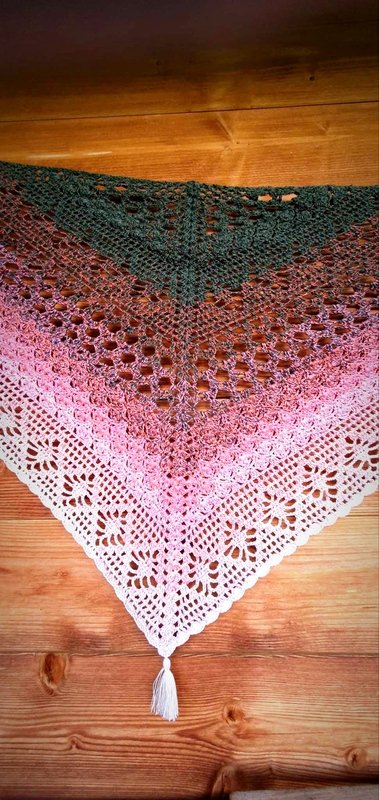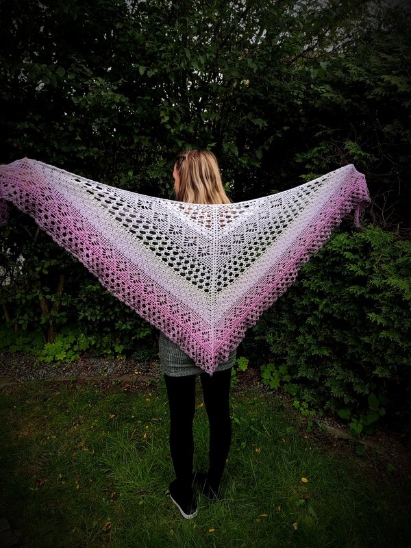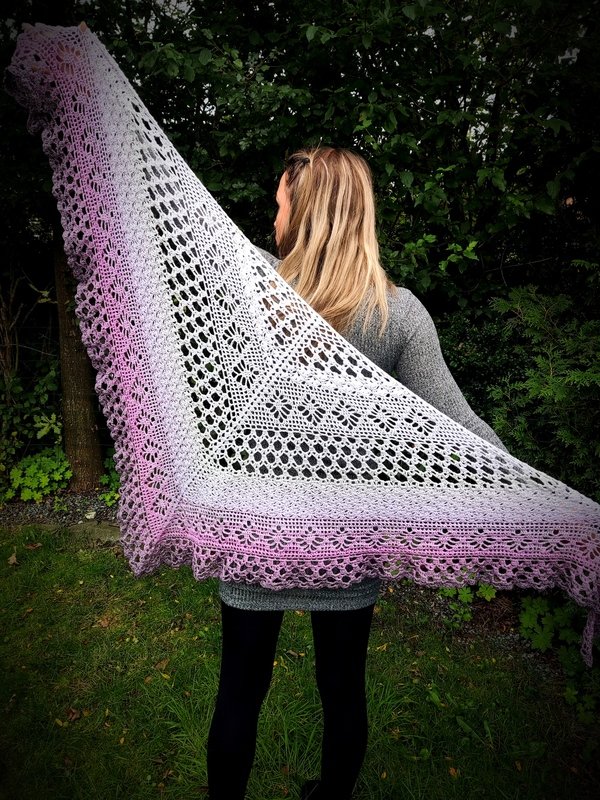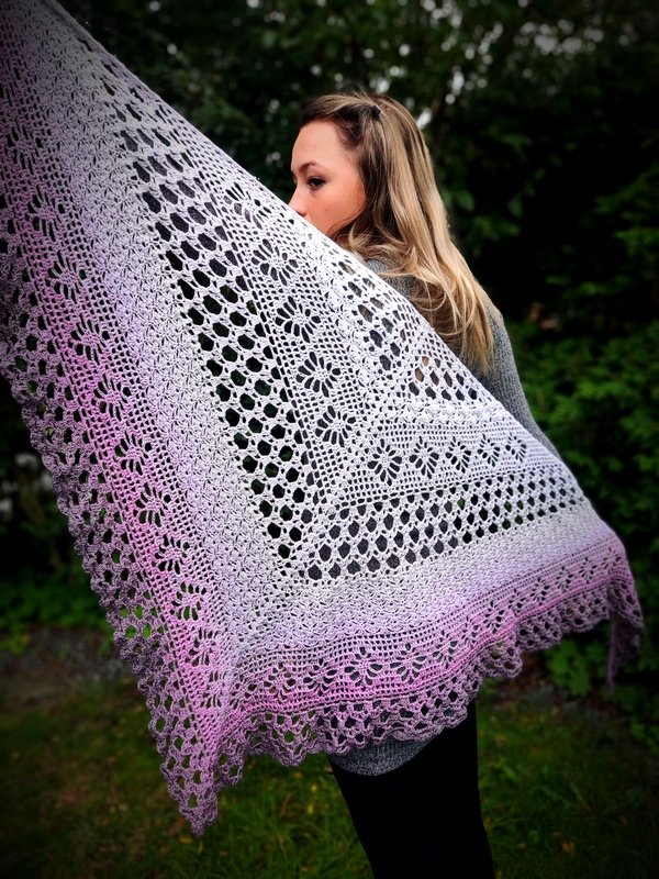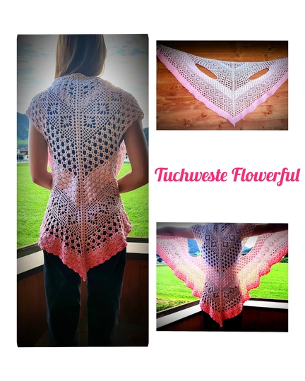 Das „Flowerful“ ist ein blumiges Dreieckstuch, dass in allen Farben wunderschön zur Geltung kommt. Mit einer kleinen Änderung, kann man auch, bei entsprechender LL, eine ganz großartige Tuchweste aus dieser Musterkombination zaubern. Die nötigen Schritte werden hierfür auch erklärt.