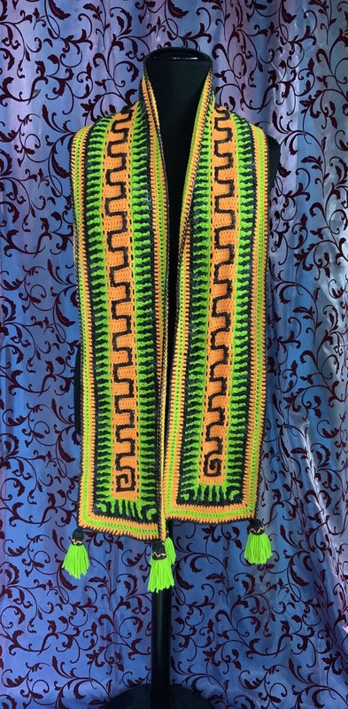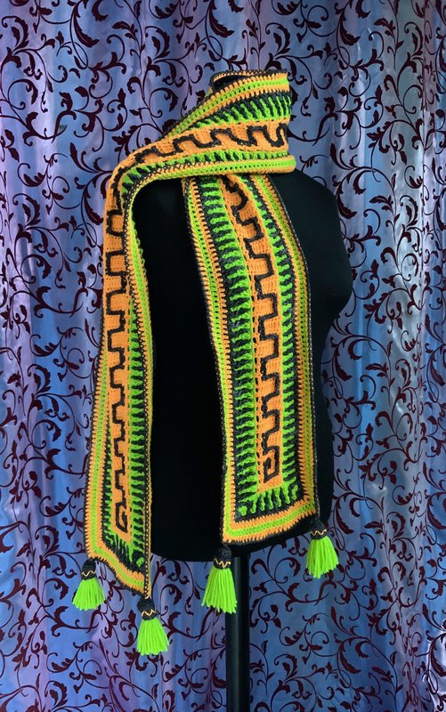 Dieser Schal ist sehr dekorativ und peppt jeden Look farblich auf.