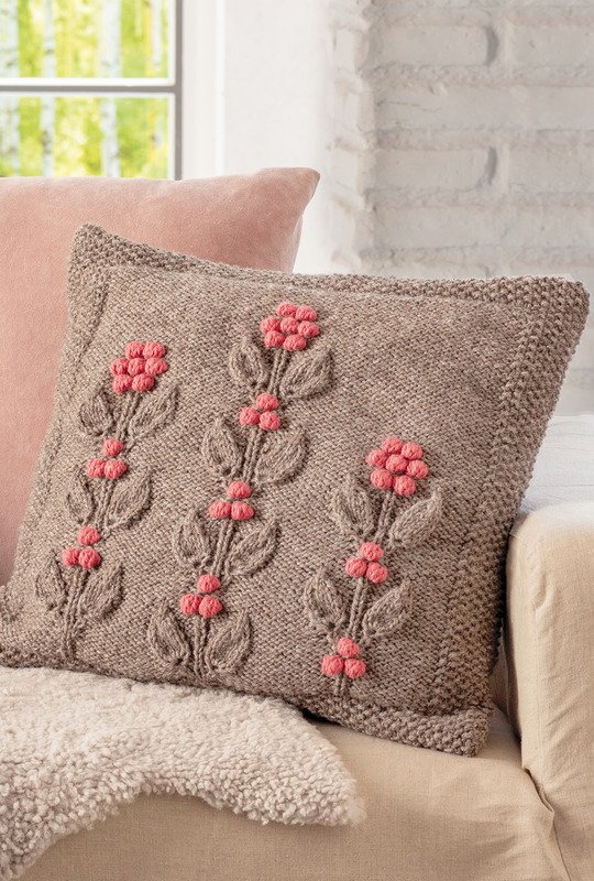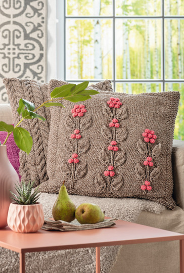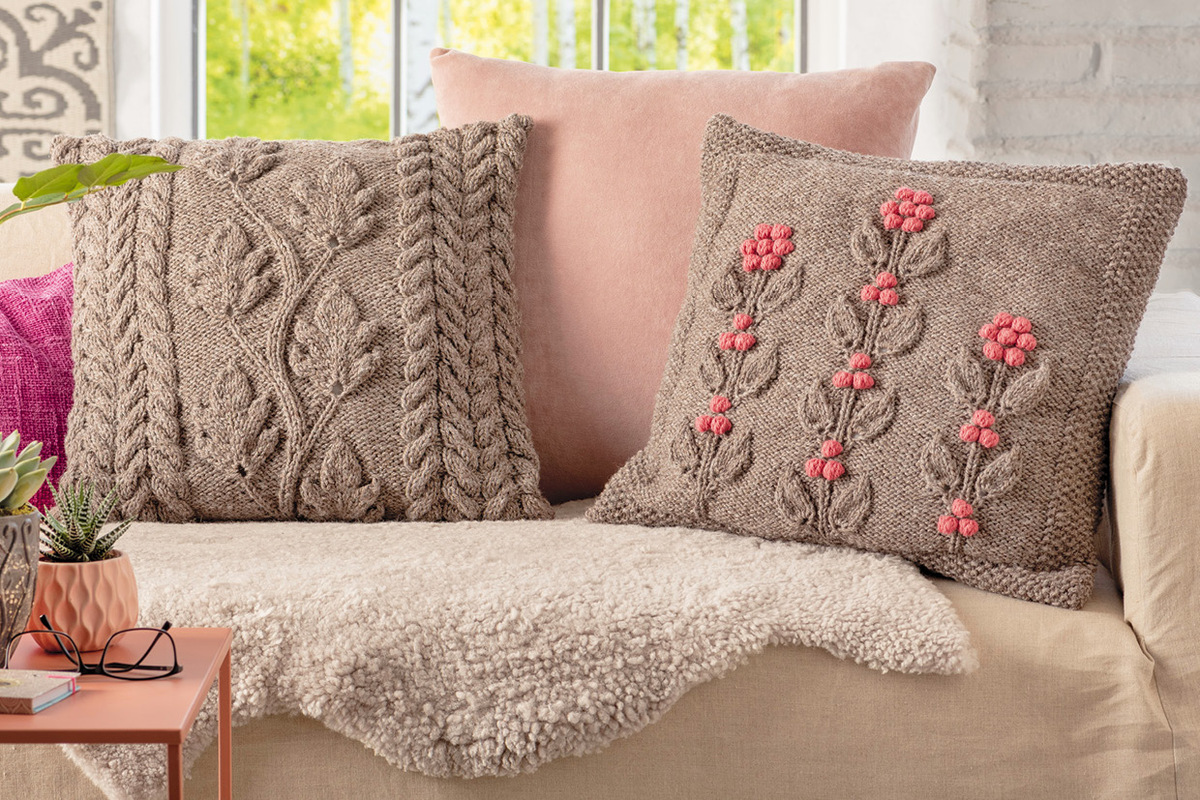 Auf kühleren Tage sollte man sich schon mal vorbereiten, damit man sich später in diese kuscheligen Strickkissen in erdigen Farbtönen schmiegen kann. Das Blumenkissen wird, ebenso wie das Kissen mit der Eichenlaubranke, glatt rechts und glatt links gestrickt, das Blumenkissen zusätzlich noch im Perlmuster und laut Strickschrift im Blumenmuster. Das Eichenlaubkissen erhält an den Seiten jeweils ein Zopfmuster und laut Strickschrift eine durchgehende Eichenlaubranke. Diese ziert das Kissen nur auf der Vorderseite, während sich das seitliche Zopfmuster auch auf der Rückseite des Kissens zeigt. Die beiden Kissen lassen sich mithilfe der ausführlichen Strickanleitungen inkl. Strickschriften auch von etwas ungeübteren Strickerinnen leicht nacharbeiten.