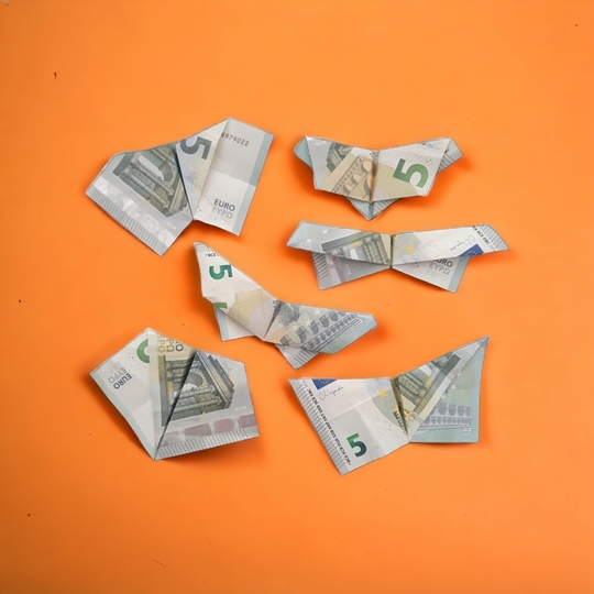 Diese zweidimensionalen Origami Geldschein Schmetterlinge werden aus je einem Geldschein gefaltet. Sie können aus jedem Euro Geldschein oder aus jeder anderen Währung gefaltet werden. Hier auf den Fotos sind sie aus je einem 5 Euro Geldschein gefaltet.