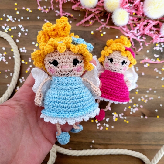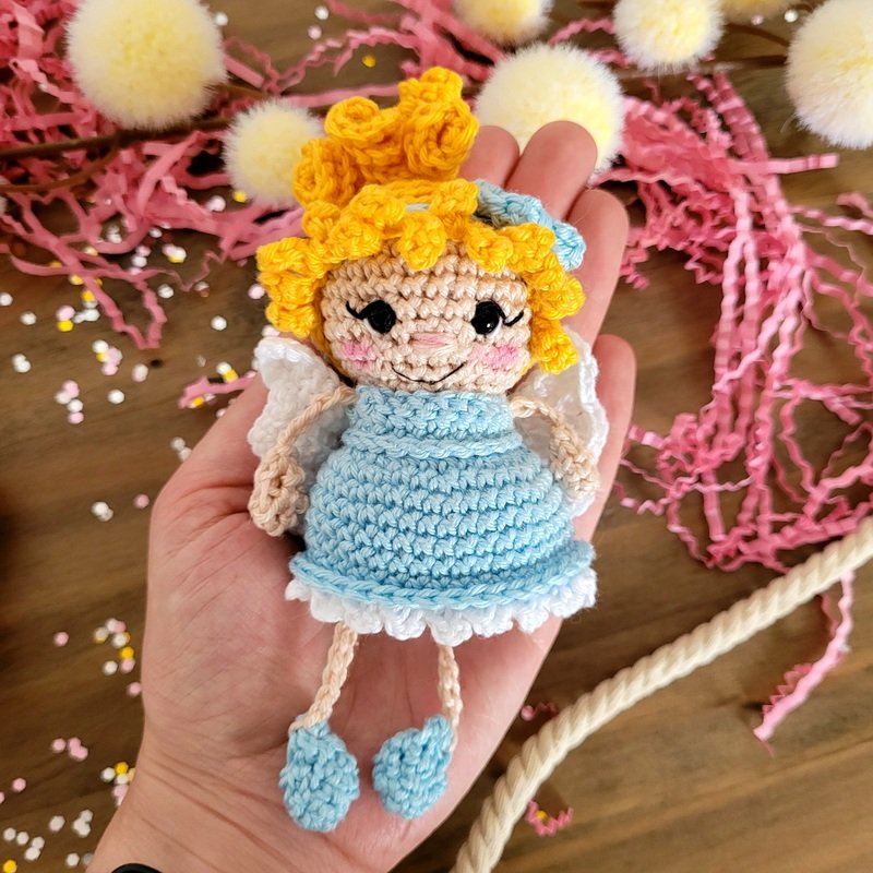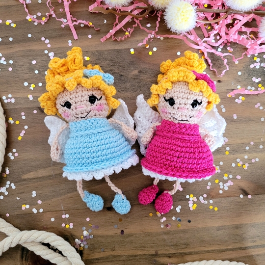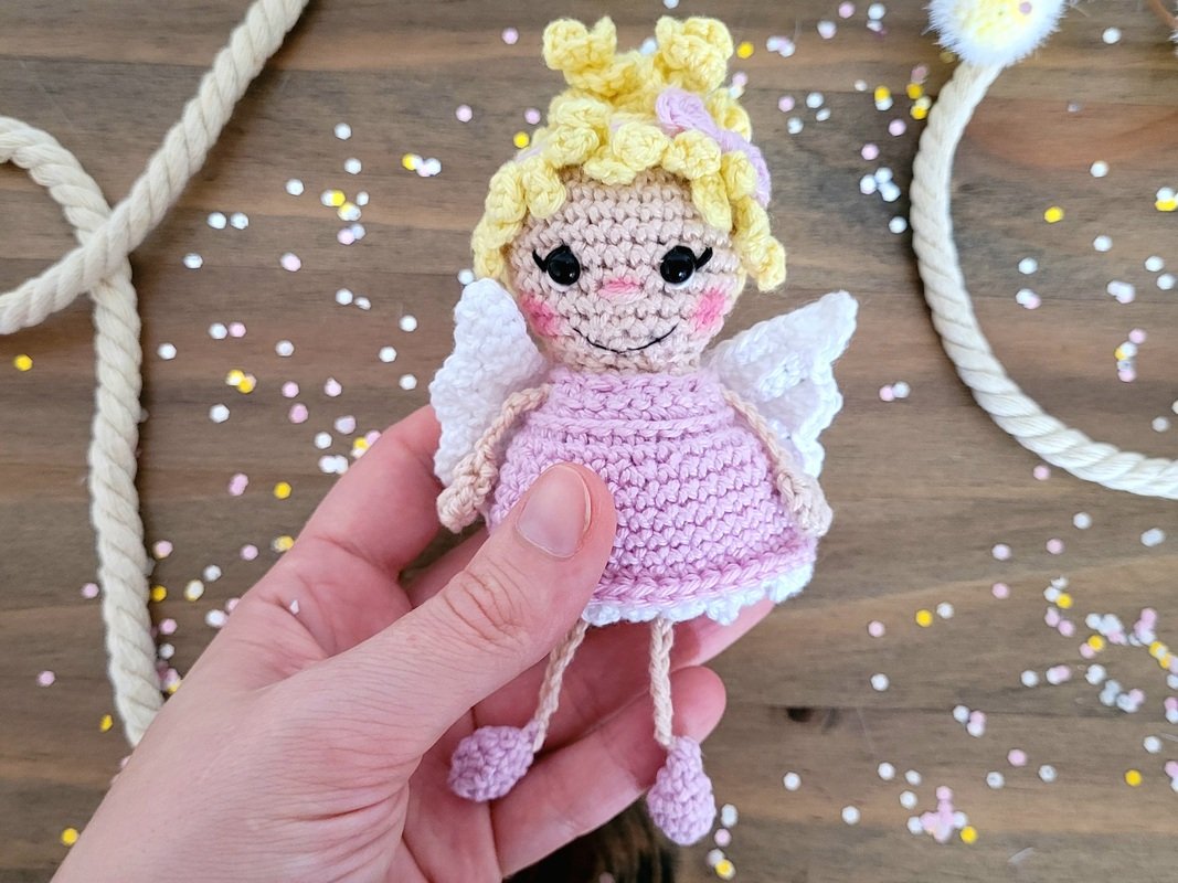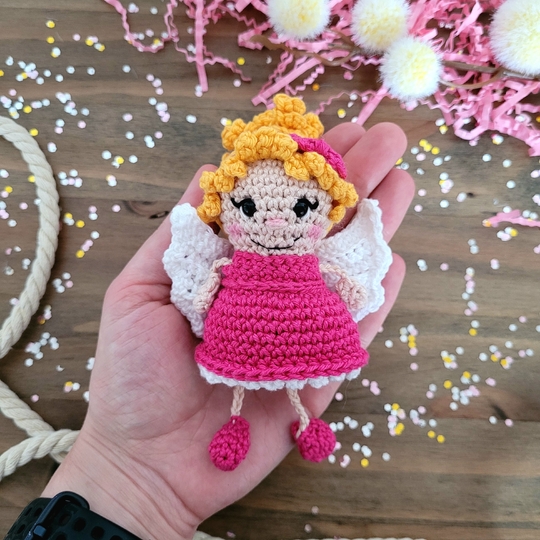 Der kleine Engel kann als Kantenhocker, Taschenbaumler, Glücksbringer oder als Deko für den Weihnachtsbaum verwendet werden.