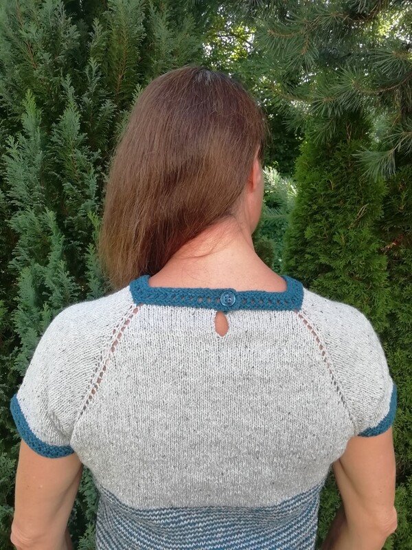 Das T-Shirt wird als Raglan von oben am Stück gestrickt - ohne Zusammennähen von Einzelteilen. Am Rückenausschnitt wird ein kleiner Tropfenausschnitt gearbeitet, der mit einem Knopf geschlossen werden kann.