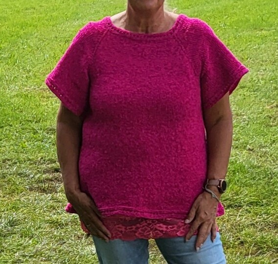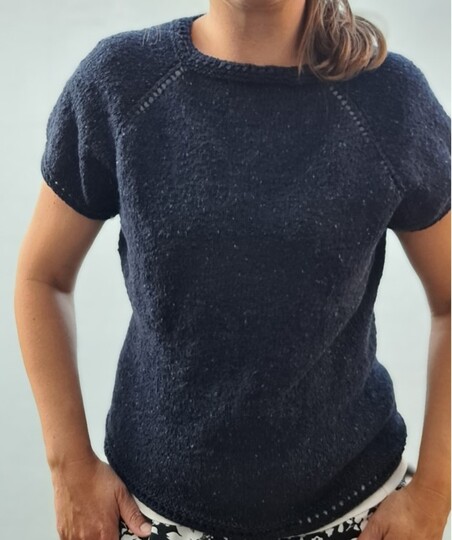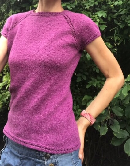 Stylische Lochmusterdetails zieren dieses einfach zu strickende T-Shirt: Lochmusterbündchen und eine Lochmusterraglanlinie.