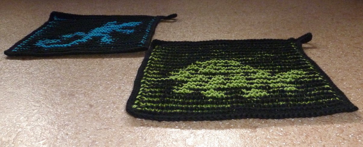 Ihr benötigt jeweils zwei gleichstarke Garne mit starkem Hell-Dunkel-Kontrast (z.B. Schwarz und eine leuchtende Farbe). Für Topflappen empfiehlt sich 8/8 Baumwollgarn (z.B. Cotton 8/8 von Hobbii).