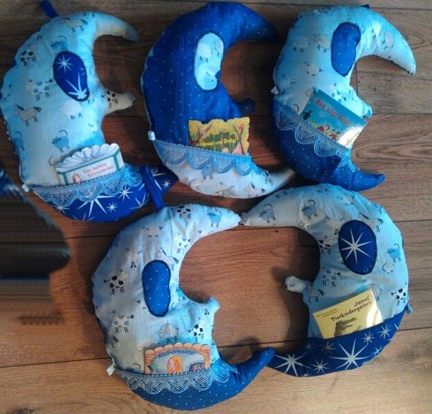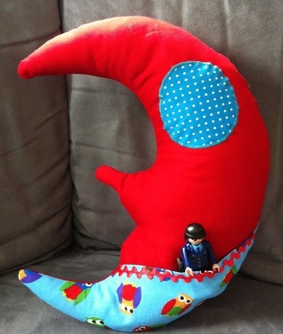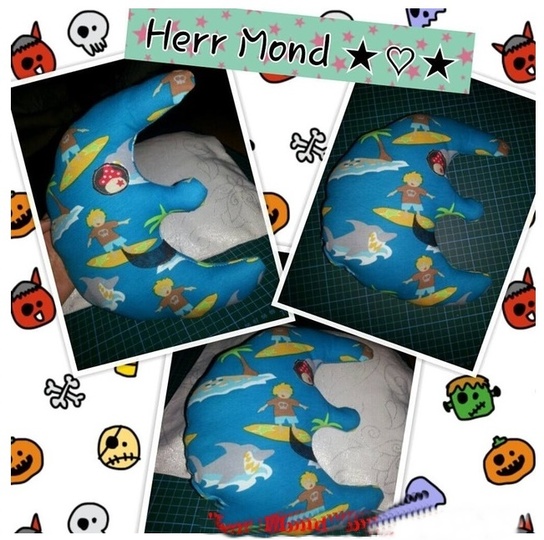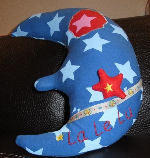 Mit dieser Nähanleitung und dem Schnittmuster könnt ihr kuschlige Mond-Kissen oder auch einen Wandbehang, eine Spieluhr oder ein Mobile nähen. Genäht werden kann Herr Mond aus allen gängigen Stoffen, z.B. Baumwolle, Plüsch oder Jersey. Das fertige Kissen hat die Maße 38 x 25 cm.