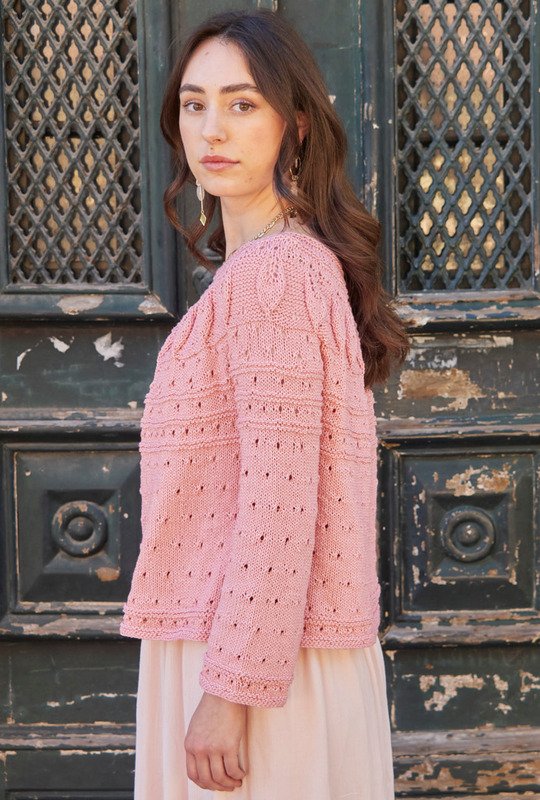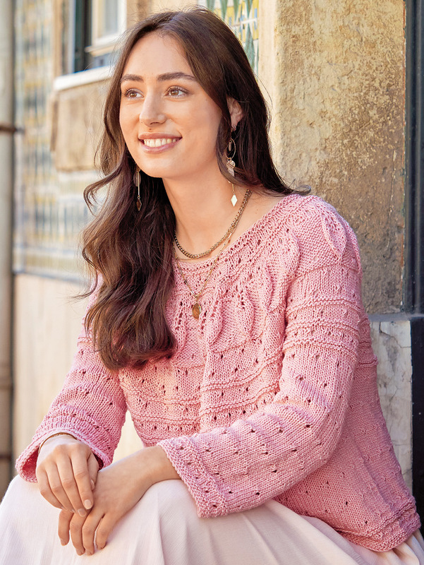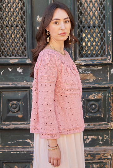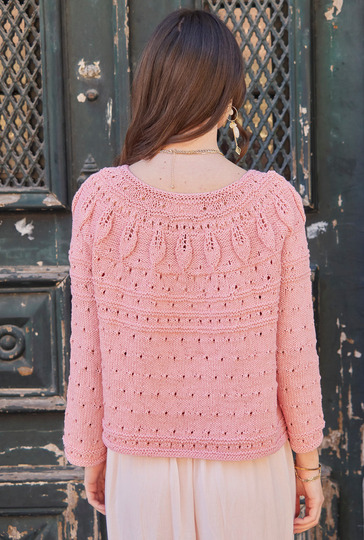 Der Rundpassenpullover wird von oben nach unten in Runden in einem Stück gearbeitet. Das erspart die Näharbeit am Ende. In der Passe wechseln sich Kraus-rechts-Streifen, ein feines Lochmuster und ein dekorativer Blattmusterstreifen ab, sodass für genug Abwechslung beim Stricken gesorgt ist. Der Polyesteranteil des lachsfarbene Baumwollmischgarn besteht aus recycelten PET-Flaschen, es ist also ganz im Sinne der Nachhaltigkeit. Saum- und Ärmelkanten haben eine kraus rechts gearbeitete Bordüre mit einem Zwischenstück aus dem oben schon bekannten Lochmuster. Die Anleitung kann für Größe 38/40 downgeloadet werden.