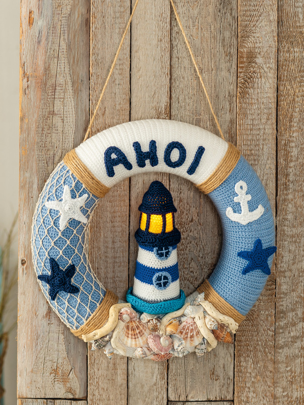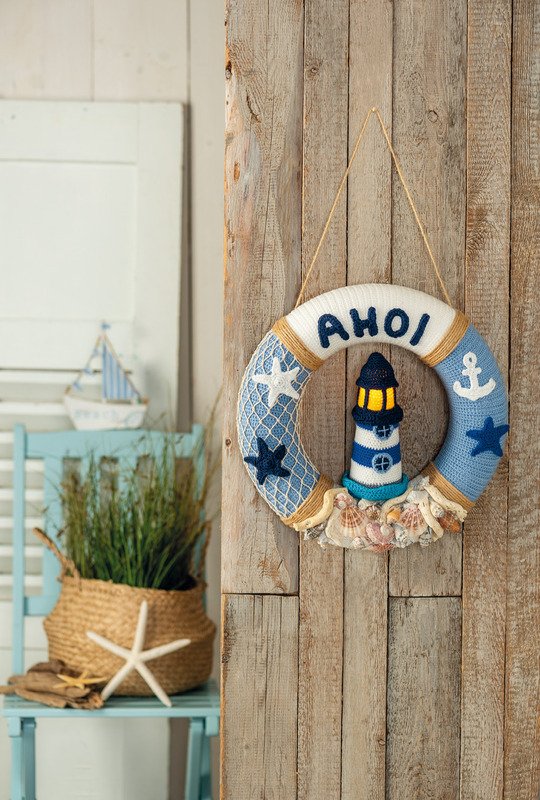 gehäkelte Kranz mit echten Muscheln genau richtig. Gehäkelt werden vor allem feste Maschen mit der Junghans Wolle „Micro“ aus 100% Polyacryl in maritimen Farbtönen. Nach der ausführlichen Anleitung ist das auch für etwas ungeübtere Häklerinnen problemlos möglich. Plakative Details des Kranzes sind die Seesterne, der Anker und der Schriftzug, die allesamt auch gehäkelt und dann aufgeklebt werden.