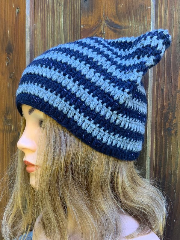 ich benutze hier 2 Knäule ( dunkelblau und grau) einer Wolle die auf 50 gr- 115 m hat und die Häkelnadel 4 + 3,5 + 1 Stopfnadel