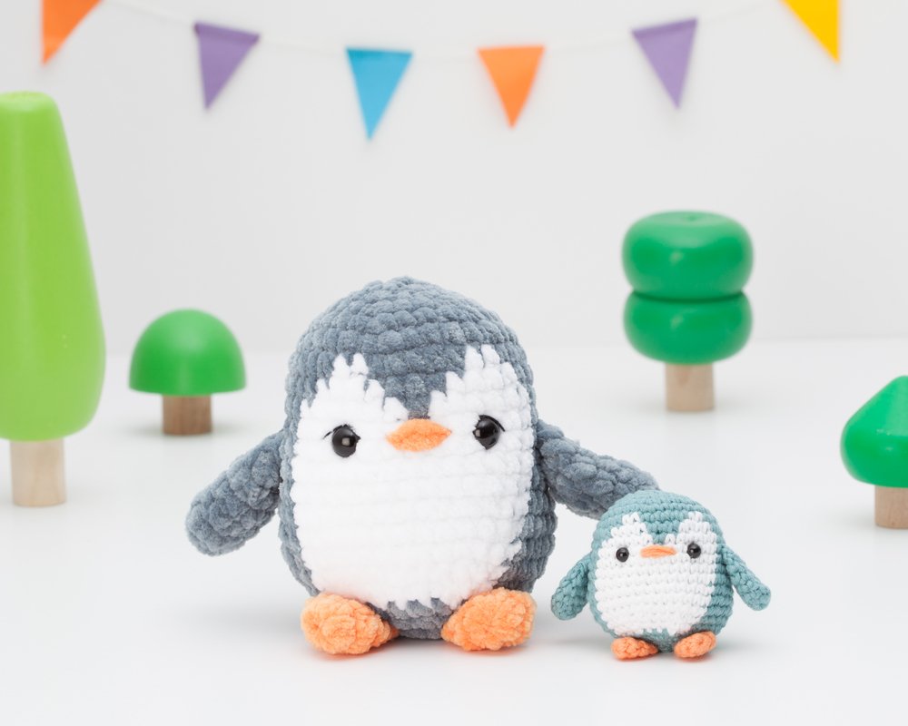 Wenn du das angegebene Garn und die angegebene Häkelnadel verwendest, wird der große Pinguin etwa 10,5 cm (4,1 Zoll) und der kleine Pinguin etwa 5 cm (1,9 Zoll) groß sein. Du kannst ihn größer oder kleiner machen, indem du ein anderes Garn benutzt, passe aber dann die Häkelnadel und die Sicherheitsaugen entsprechend an.