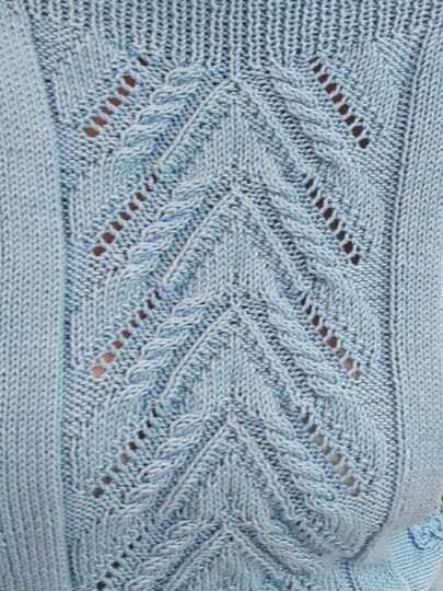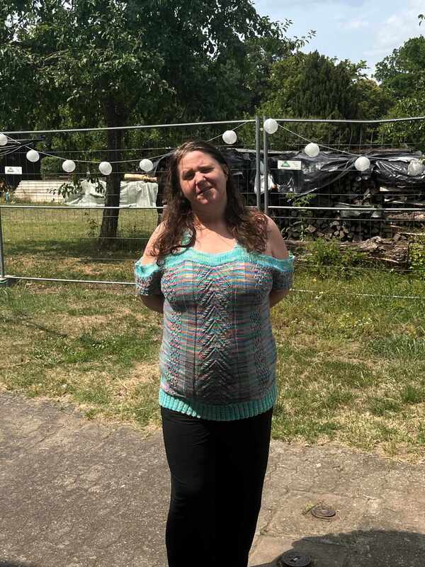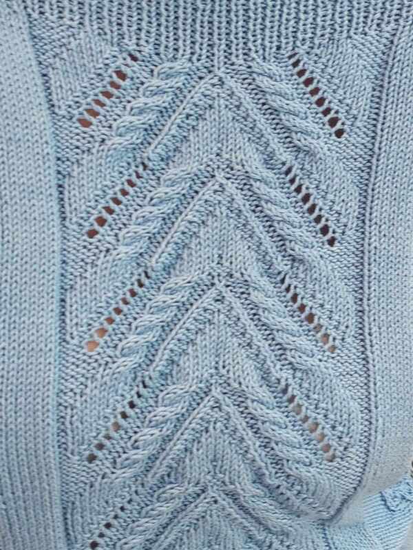 Dieses tolle Shirt wird in zwei Teilen von unten nach oben gestrickt. Dabei werden individuell ab halber Höhe die Maschen für die Ärmel mit aufgenommen. Oben strickst Du beide Teile zusammen und lässt einige cm frei für die Cutouts und den Ausschnitt. Das Ajourmuster läuft dezent an den Rumpfseiten, auf den Armen und um den Ausschnitt herum. Du kannst natürlich auch die Cut-outs weglassen und lässt nur den Ausschnitt offen. Wie das alles funktioniert, ist in der Anleitung alles ausführlich erklärt und mit Video-Links unterlegt.