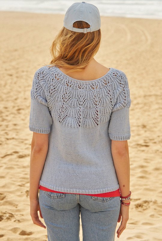 Bei diesem Kurzarmpulli aus Baumwollmischgarn kannst du getrost auf Kette & Co. verzichten, denn er lenkt die volle Aufmerksamkeit auf den reich verzierten Halsbereich. Vorder-, Rückenteil und Ärmel werden bis zum Beginn der Passe separat glatt rechts gestrickt, dann werden die Teile zusammengesetzt und die Ajourmusterpasse rund gearbeitet. Tipp: Wer sich ein paar Nähte ersparen will, kann Vorder- und Rückenteil bis zu den Armausschnitten auch gleich rund stricken. Die kurzen Ärmel haben eine vorteilhafte Länge, was besonders bei stärkeren Oberarmen eine schönere Silhouette ergibt. Die Anleitung hierfür gibt es in den Größen 36/38, 40/42 und 44/46.