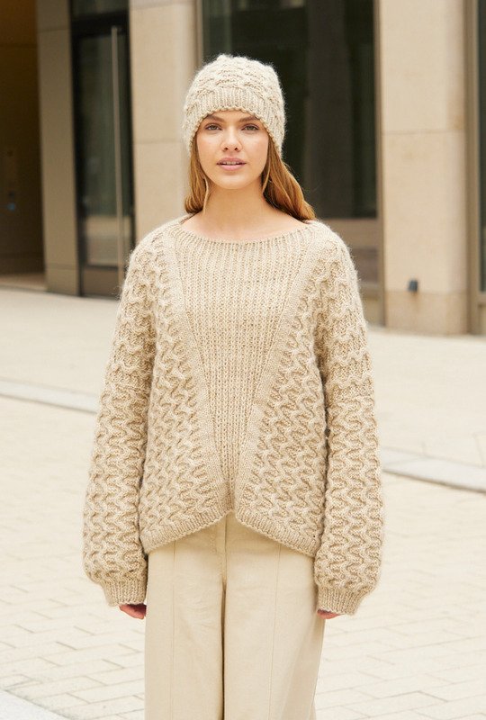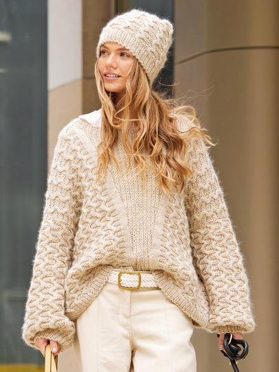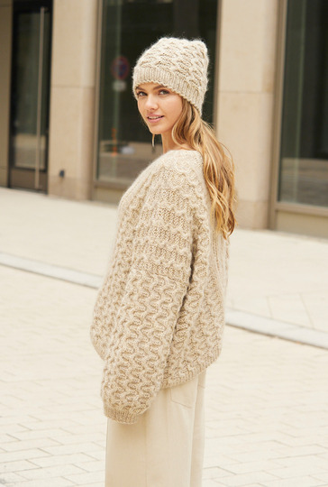 Ein Pulli mit passender Mütze aus kuschelweichem Schurwollgarn mit Mohair. Die lässige Form des Pullis mit weit überschnittenen Schultern entsteht durch die Verbreiterung der V-Passe und nur wenigen Abnahmen an den Seiten. Halbpatent in der Mitte, seitlich je ein Glatt-rechts-Streifen und danach das plastische Wellenmuster ergeben einen sportlichen Pulli Jeans. Der weite, runde Halsausschnitt ist mit einer Rippenblende eingefasst; auch die Bündchen haben dieses Rippenmuster. Mit Beanie im selben Muster bist du perfekt gekleidet für einen Stadtbummel im Winter. Du kannst den Pulli in den Größen 34 – 38, 40 – 44 und 46 – 50 und die Mütze mit 54 – 56 und 57 – 59 cm Kopfumfang nachstricken.