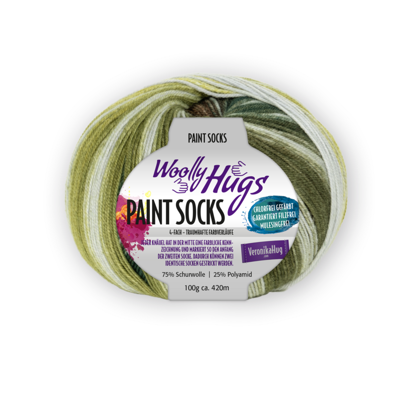 Material: Woolly Hugs PAINT SOCKS (75 % Schurwolle, 25 % Polyamid, Lauflänge ca. 420 m/100 g) von Langendorf & Keller: 200 g in Wunschfarbe (Original in Farbe 206)