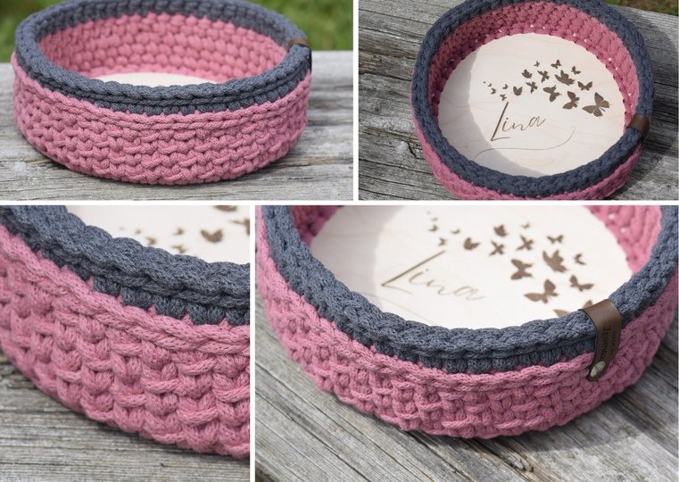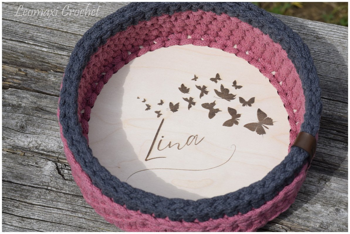 Ich arbeite hier mit meinen Holzböden und dem Bobbiny Premium, der mittleren Stärke der Bobbiny Flechtkordeln. In der Anleitung erkläre ich dir das Häkeln mit ovalem und rundem Boden, auch wie du mit dem dickeren Bobbiny Jumbo und den Böden mit größeren Löchern häkeln kannst. Mit einer schönen Gravur auf dem Boden kannst du dein Körbchen zu einem individuellen Einzelstück machen, perfekt als Geschenk oder zum selber behalten.