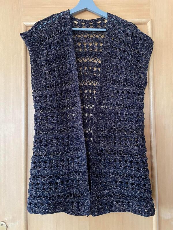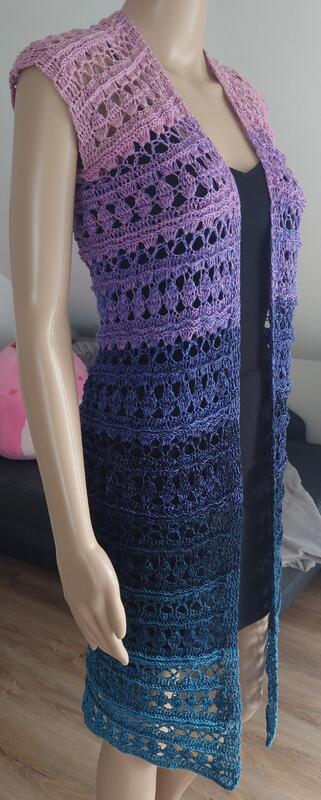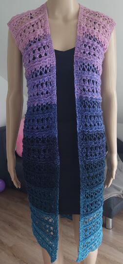 Ich habe für Konfektionsgröße 36 1200m Lauflänge eines 3fädigen Farbverlaufgarns benötigt. Meine Weste ist damit knielang geworden. Wenn ihr dieselbe Länge, wie ich, häkeln möchtet, dann benötigt ihr pro Konfektionsgröße größer oder kleiner ca. 150m mehr bzw. weniger Garn.