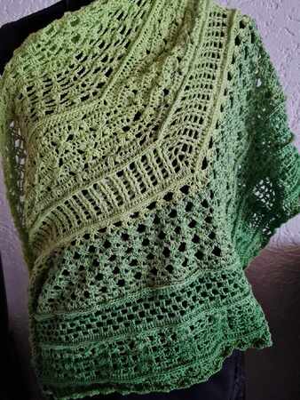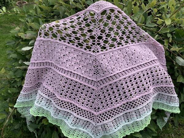 Diese Anleitung bietet die Möglichkeit, das Tuch individuell zu gestalten. Nein, nicht die Wolle ist gemeint, vielmehr muss man hier vor dem Häkeln einige Entscheidungen treffen. Es besteht aus 8 verschiedenen Mustersätzen, wobei es hier einige Auswahlmöglichkeiten gibt.