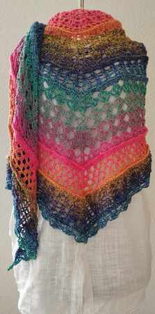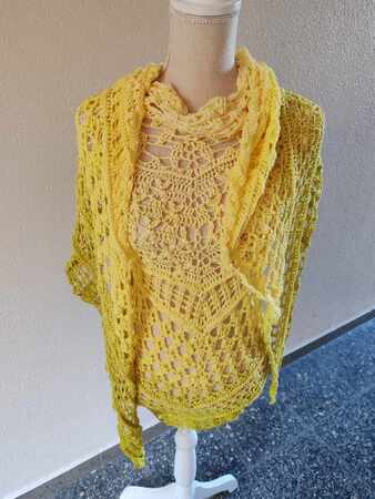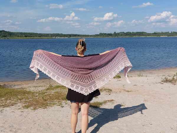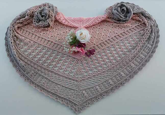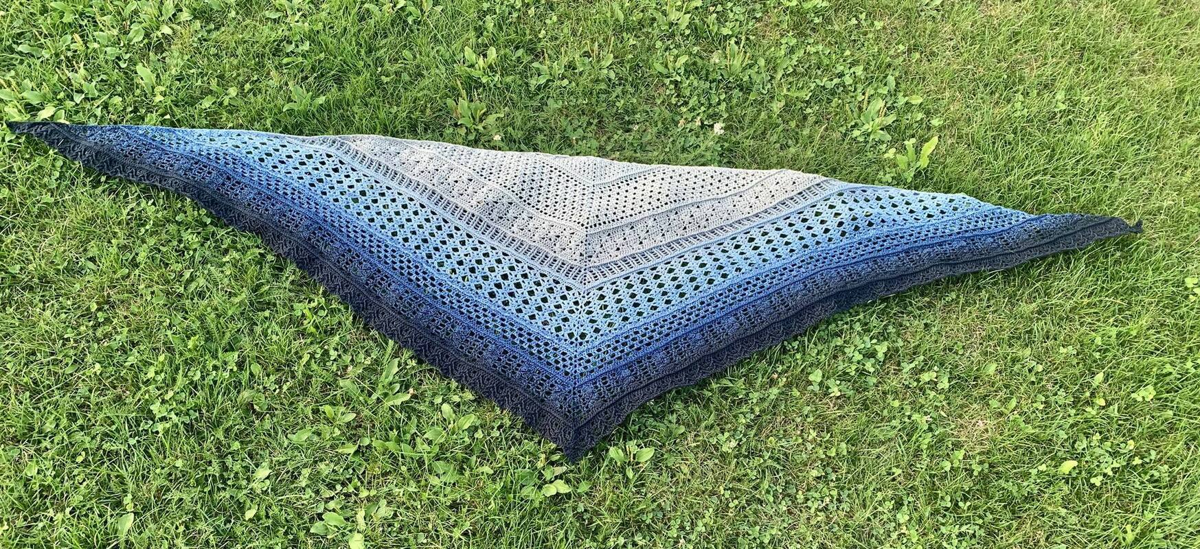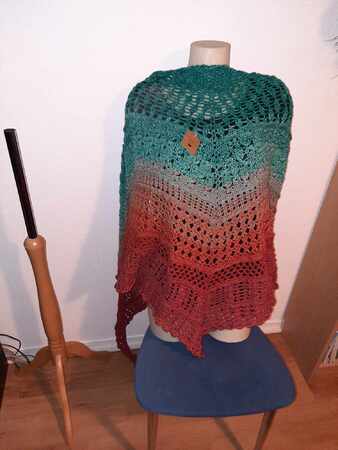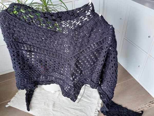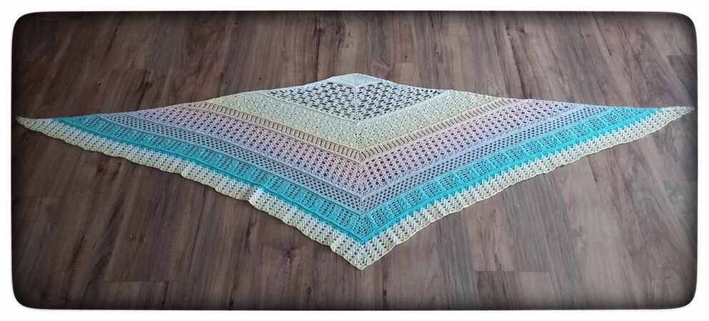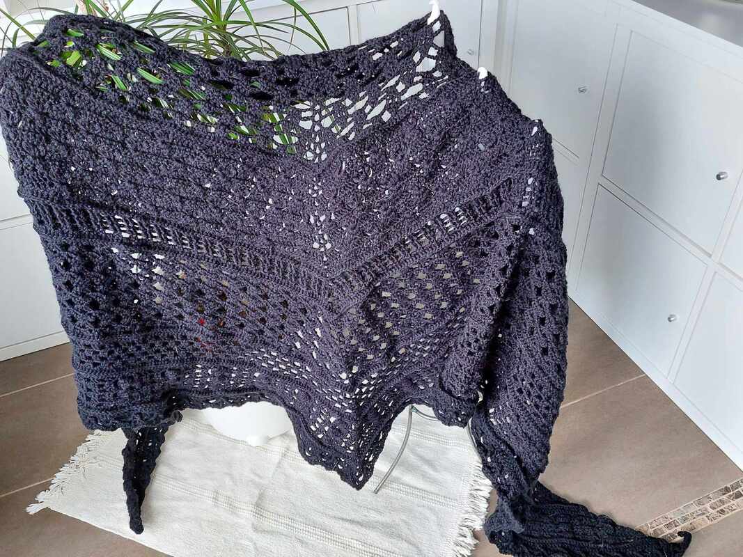 Mit Nadelstärke 3,5 und 4fädigem Garn wurde das Tuch zwischen 2,4 und 3 m lang. Die Tiefe variiert zwischen 70 und 90 cm. Eine Tabelle am Ende des Tuches gibt viele Größenangaben verschiedener Testhäklerinnen an. Hier kann man sich dann gut orientieren.