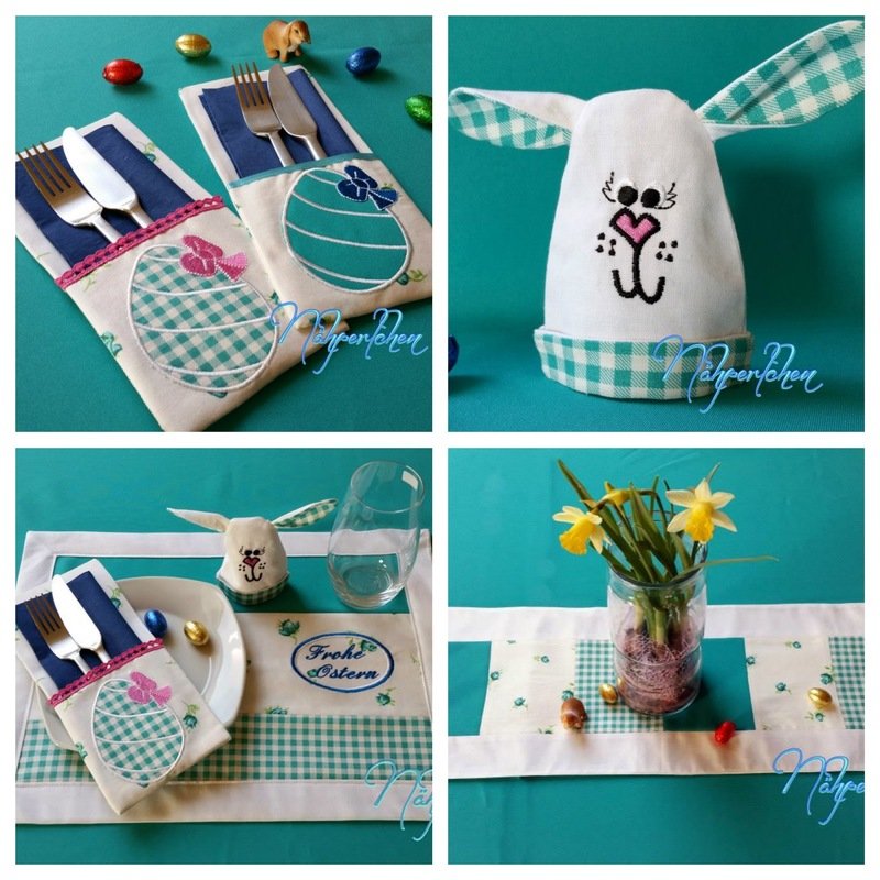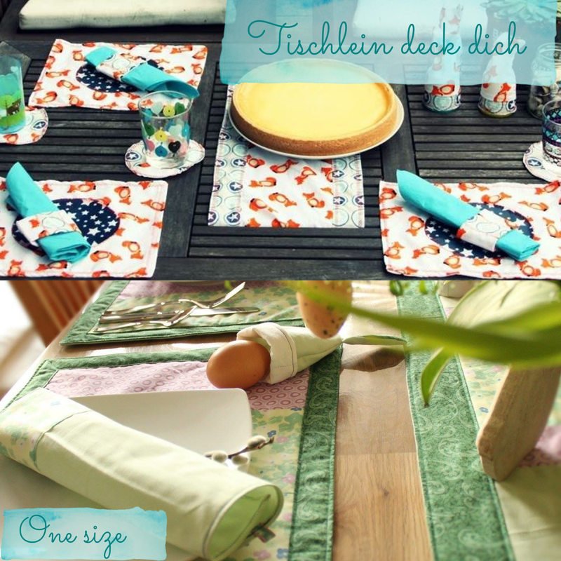 Schritt für Schritt werdet ihr beim Nähen begleitet, sodass ihr euch einen Tischläufer, Glasuntersetzer, Platzdeckchen, Serviettenringe, Bestecktasche, Eierwärmer und Give aways für Gäste nähen könnt. Das Give away ist eine kleine Goodietasche, die gleichzeitig auch als Platzkärtchen genutzt werden kann.