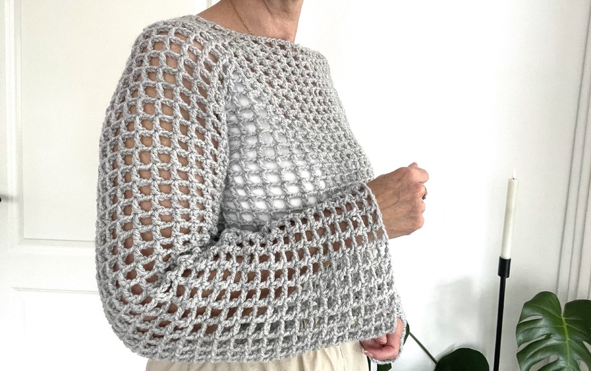 Größe: small– medium Sie können es einfach größer machen, indem Sie nach Reihe 11 weitere Reihen hinzufügen – probieren Sie den Pullover beim Häkeln ab und zu an