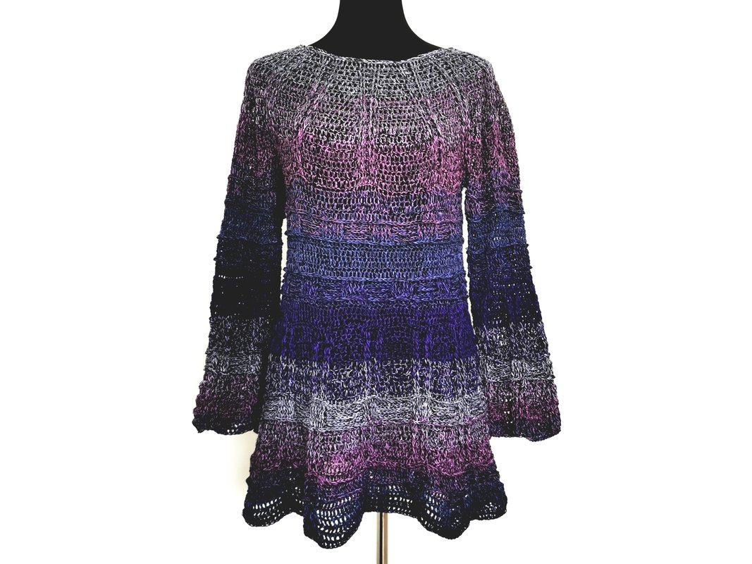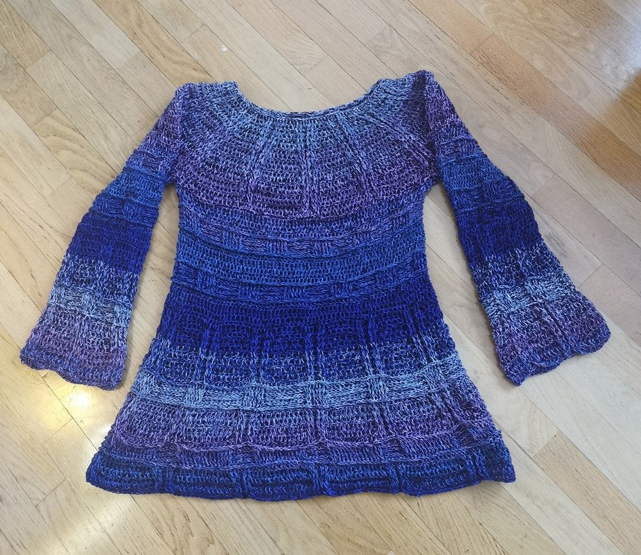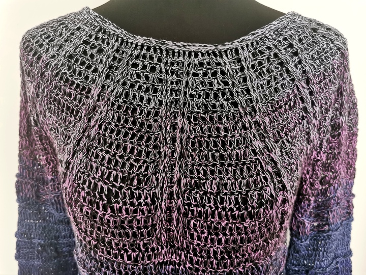 Der Pulli wird in einem Stück von oben nach unten gearbeitet, die Ärmel werden extra angehäkelt.
