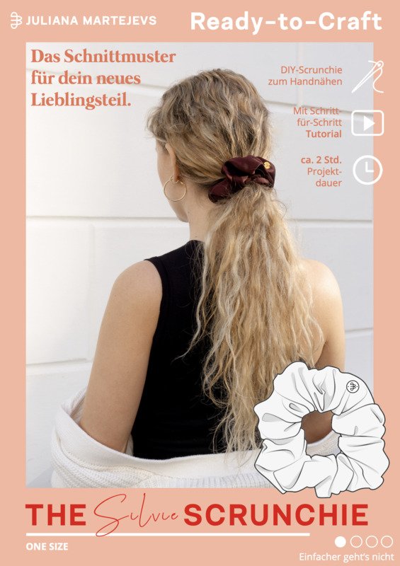 Das Schnittmuster als Ebook für dein neues Haarband "The Silvie Scrunchie". Mit kostenloser Video-Anleitung auf unserem YouTube-Kanal JULIANA MARTEJEVS - Das DIY-Modelabel oder unserer Website (s. Profil).