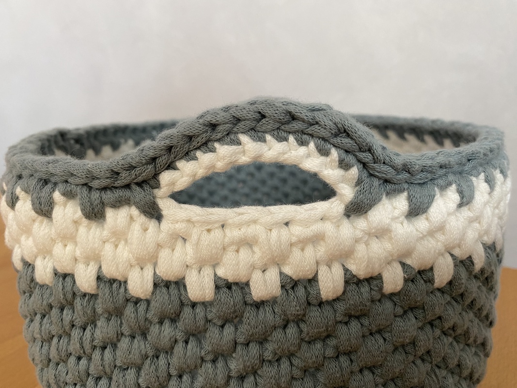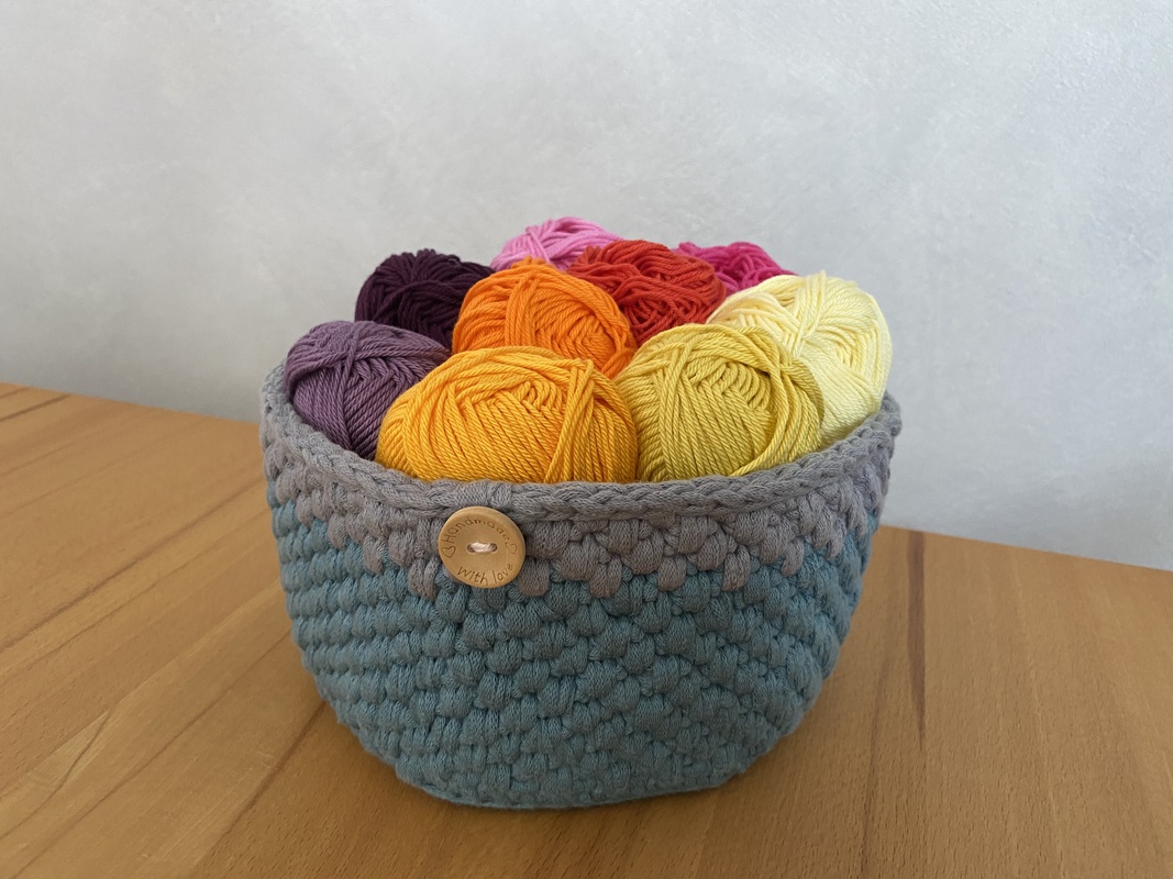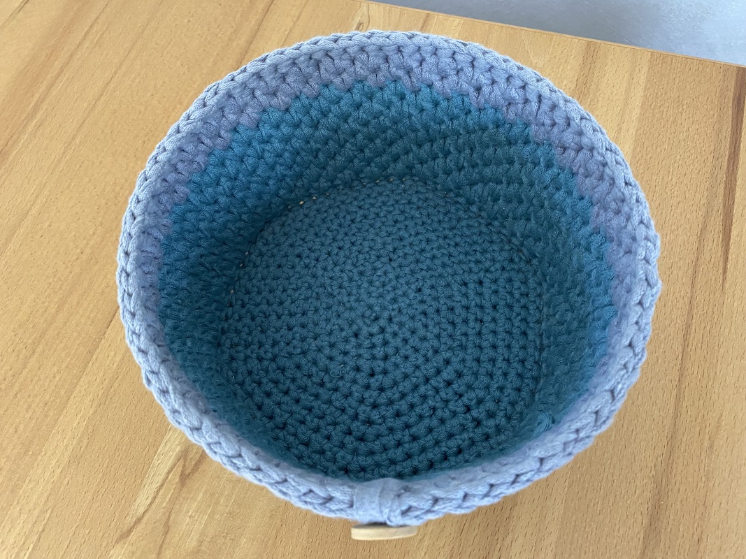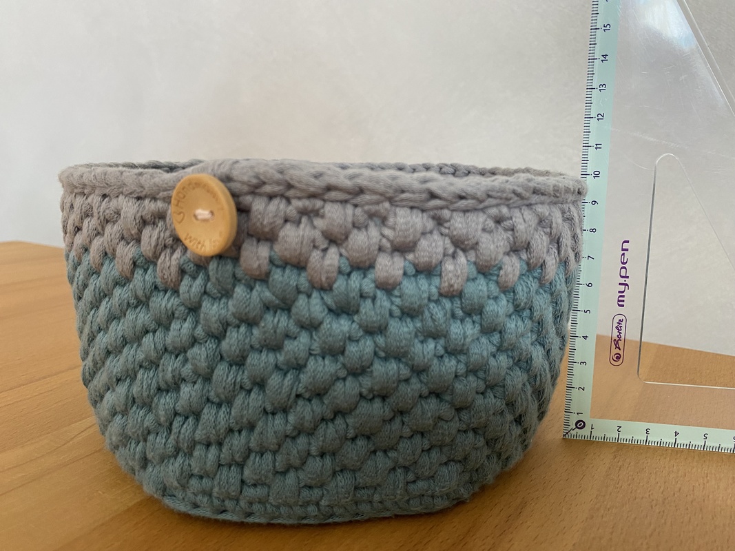Meine fertiger Wollkorb hatte 20cm im Durchmesser und ist ca. 10cm hoch.
