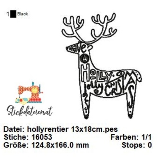 Dieses Stickdatei-Set enthält ein stilisiertes Rentier in 2 verschiedenen Größen, das kreativ aus weihnachtlichen Schriftzügen zusammengesetzt ist. Das Rentier, ein klassisches Symbol der Weihnachtszeit, ist hier auf einzigartige Weise dargestellt, indem es aus Wörtern und Phrasen gebildet wird, die mit der Weihnachtszeit in Verbindung stehen.
