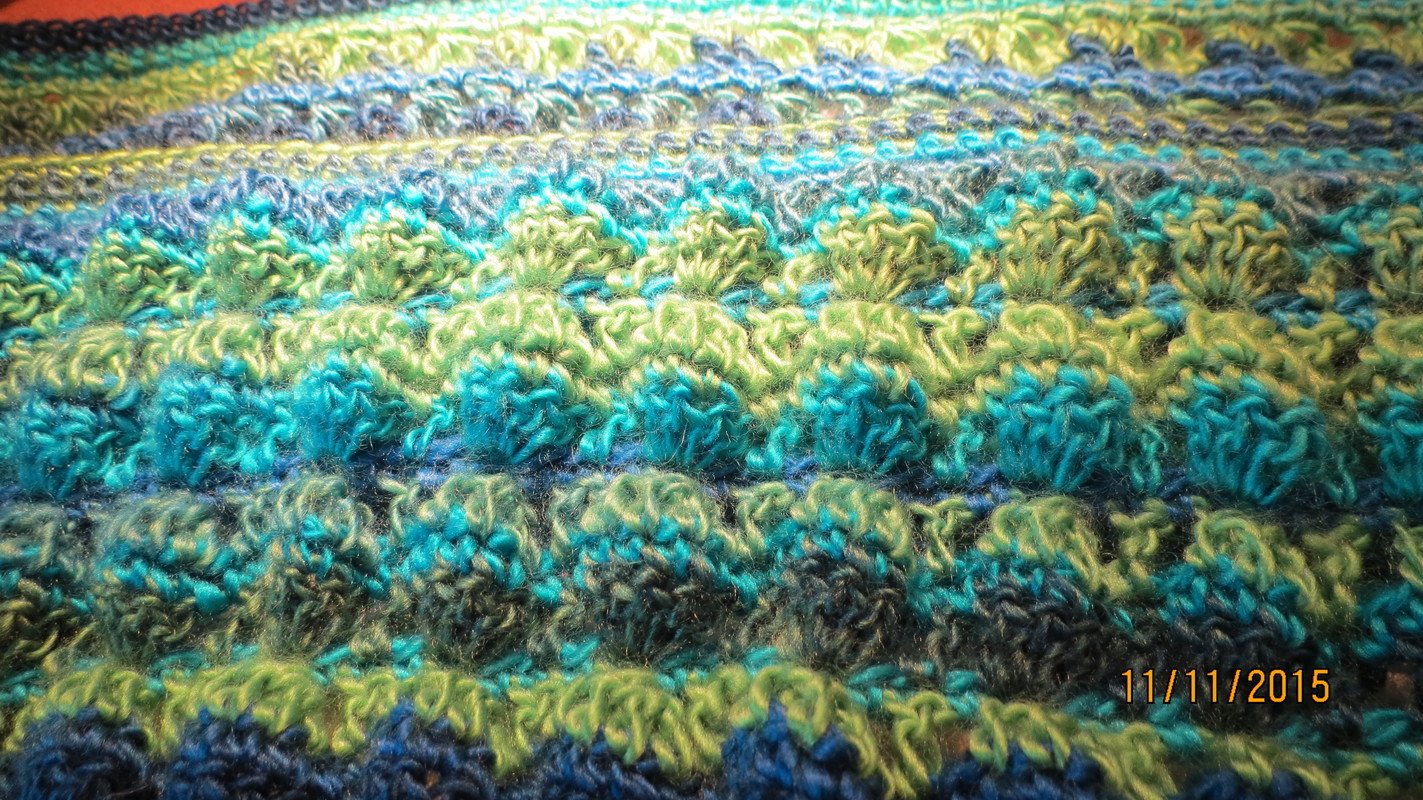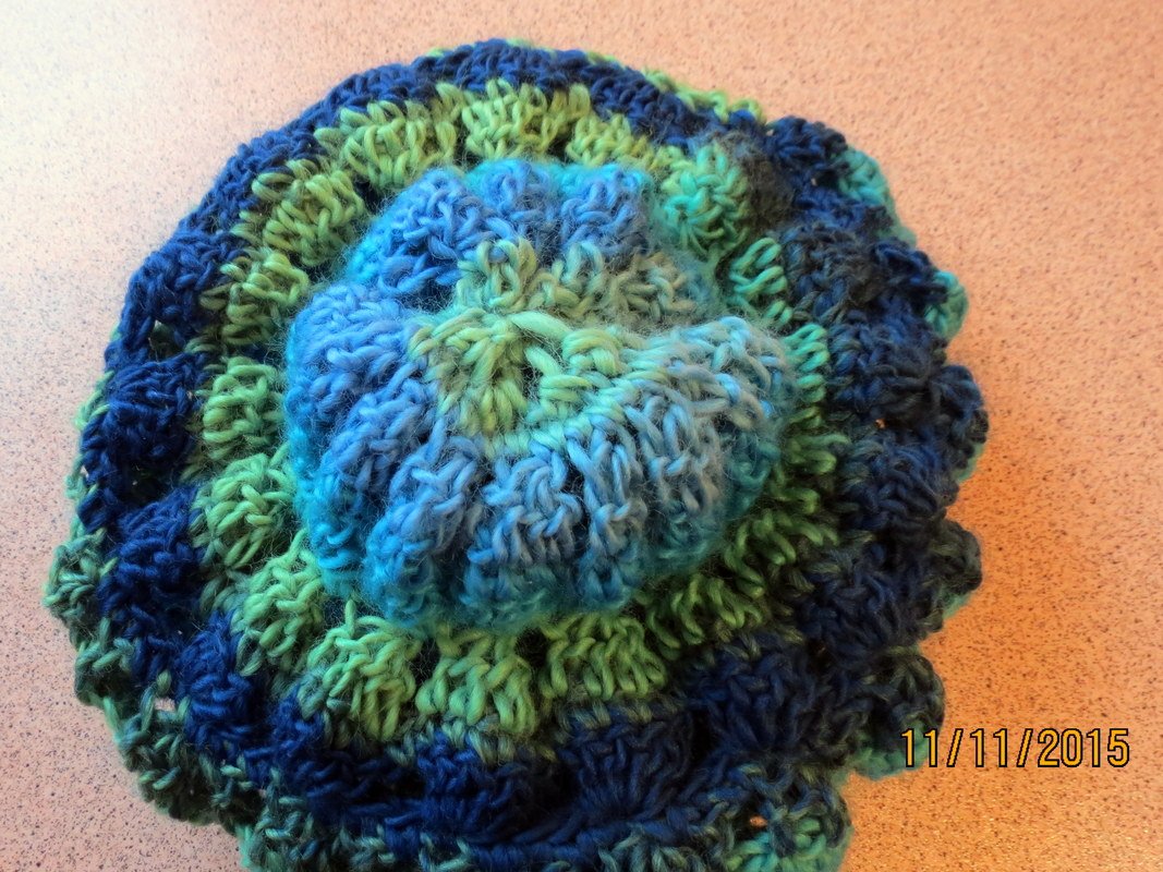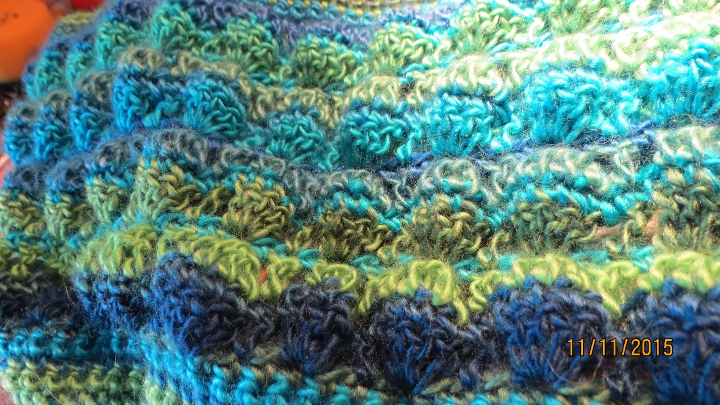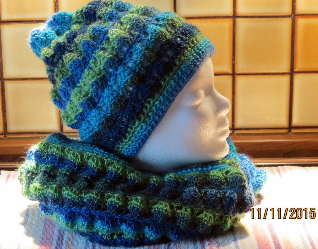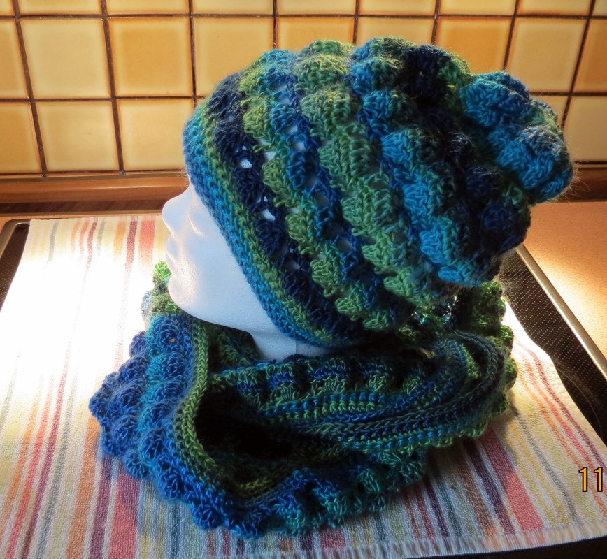 Mütze und Loop "Polarlicht", passend zum gleichnamigen Poncho, ebenfalls gehäkelt im Walnussmuster.