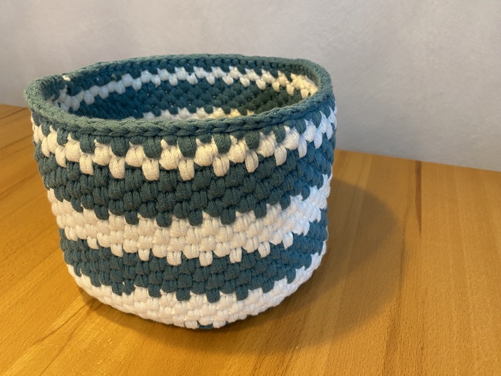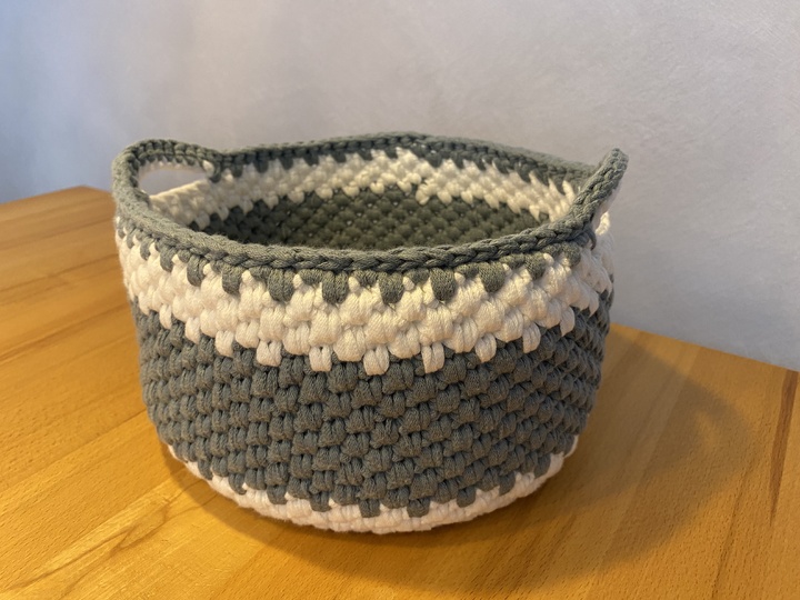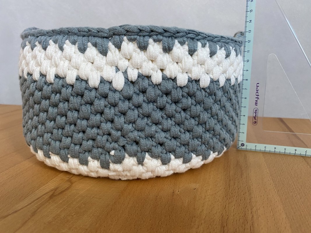 Meine fertigen Körbe: großer Korb mit Henkel wurde 23 cm im Durchmesser, Höhe 12 cm und der hohe Korb ohne Henkel wurde 19 cm im Durchmesser und ist 15cm hoch.
