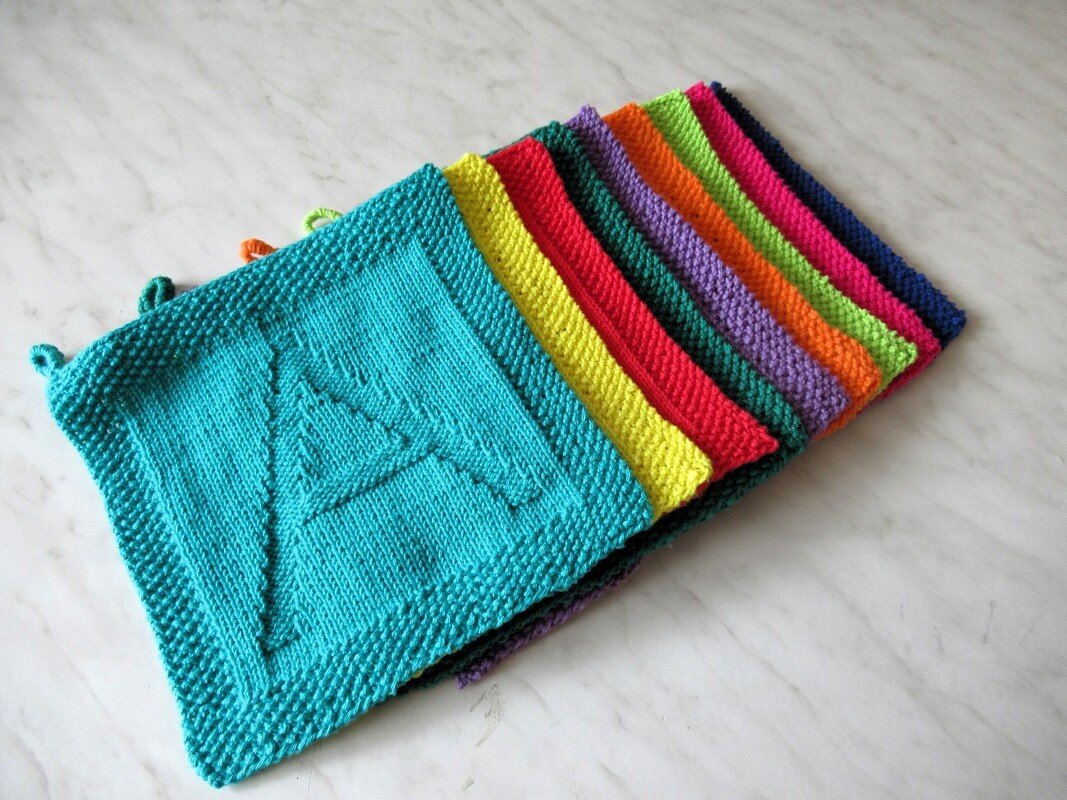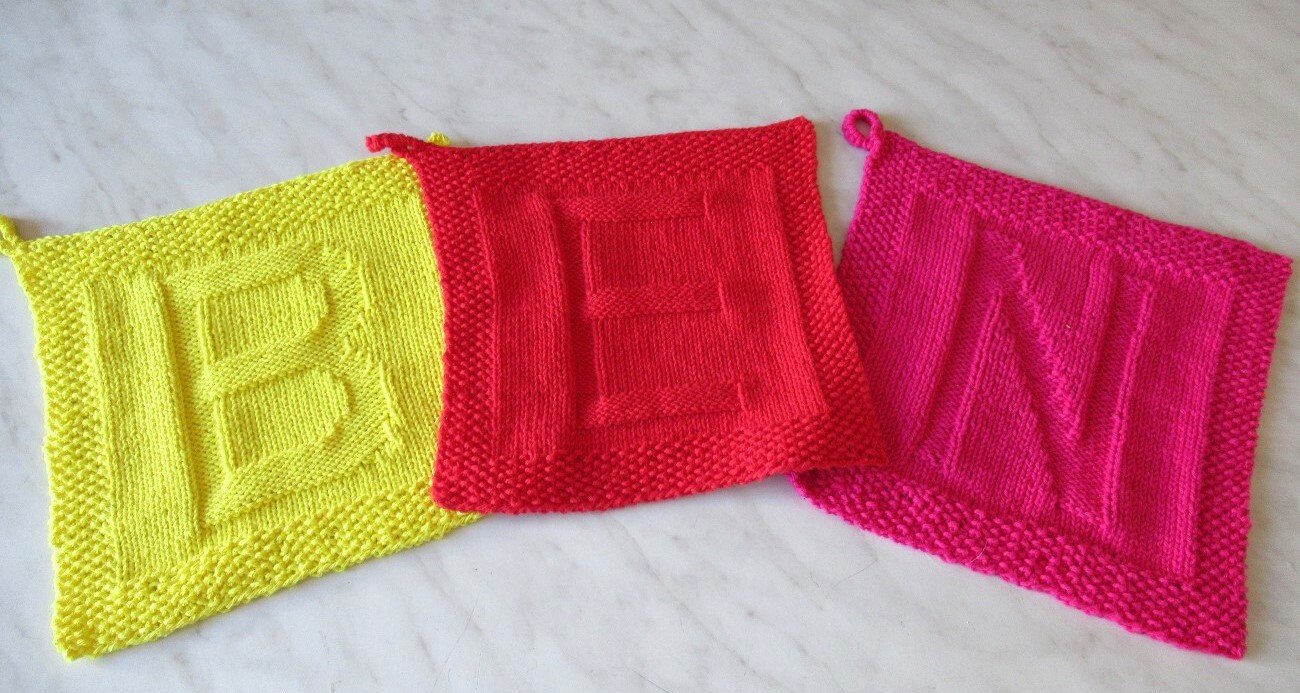 Du bekommst hier die Anleitungen für gestrickte Spültücher mit Buchstaben für alle großen Buchtaben des Alphabets. Die Tücher können als Spültücher, Waschlappen, Topflappen oder Untersetzer verwendet werden. Du kannst aber auch mehrere aneinander fügen und so eine Decke oder ein Kissen daraus machen. Die Buchstaben können auch in einen Kinderpullover oder einen Schal integriert werden: deiner Phantasie sind keine Grenzen gesetzt.