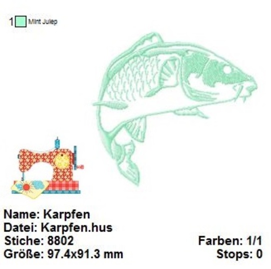 Unsere Stickdatei präsentiert einen kunstvoll stilisierten Karpfen, der mit großer Sorgfalt und Liebe zum Detail entworfen wurde. Dieses Design ist perfekt für alle Karpfen- und Fischliebhaber und bietet eine einzigartige Möglichkeit, Ihre Leidenschaft für diese faszinierende Spezies zu zeigen.