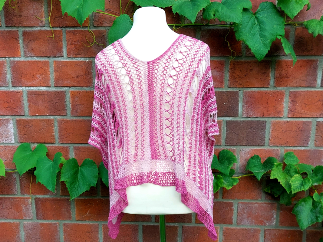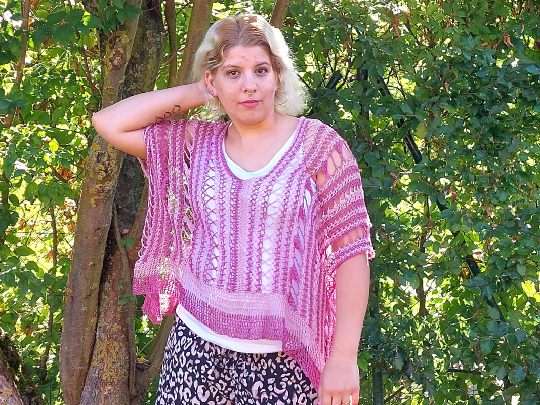 Das Netzshirt lässt sich mit jeder beliebigen dünneren Wolle häkeln. Eine Maschenprobe muss nicht gemacht werden, da es auf die persönlichen Körpermaße angepasst wird. Die Mengenangabe unten bezieht sich auf ein luftiges Shirt in Größe 38/40 (siehe Fotos). Bei kleineren oder gößeren Größen muss der Wollverbrauch entsprechend angepasst werden. Genauso muss die Nadelstärke der verwendeten Wolle angepasst werden. Ich habe dabei eine größere Nadelstärke als angegeben verwendet, um das Shirt möglichst luftig zu gestalten.