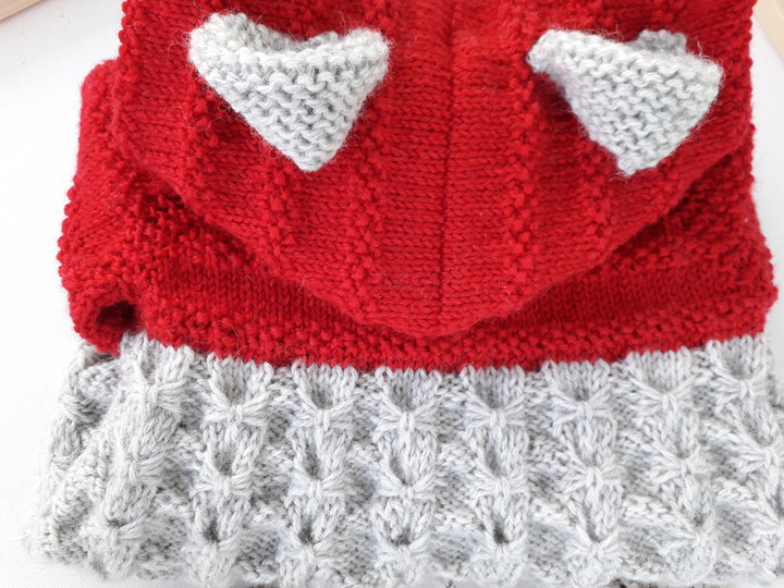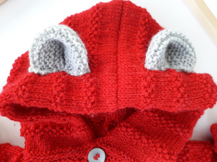 Weiters hat er eine süße Kapuze mit niedlichen Öhrchen und zwei Taschen (z.B. für den Schnuller) im Vorderteil. Natürlich ist auch das alles genauestens beschrieben.