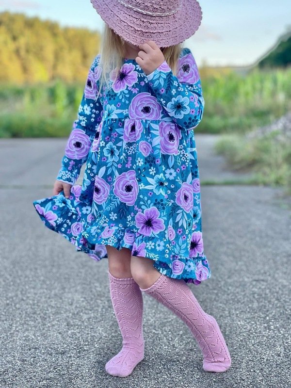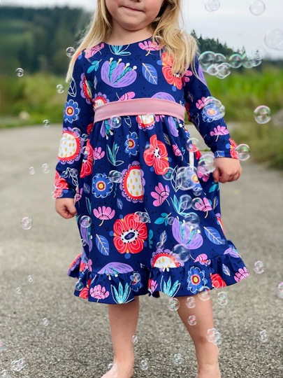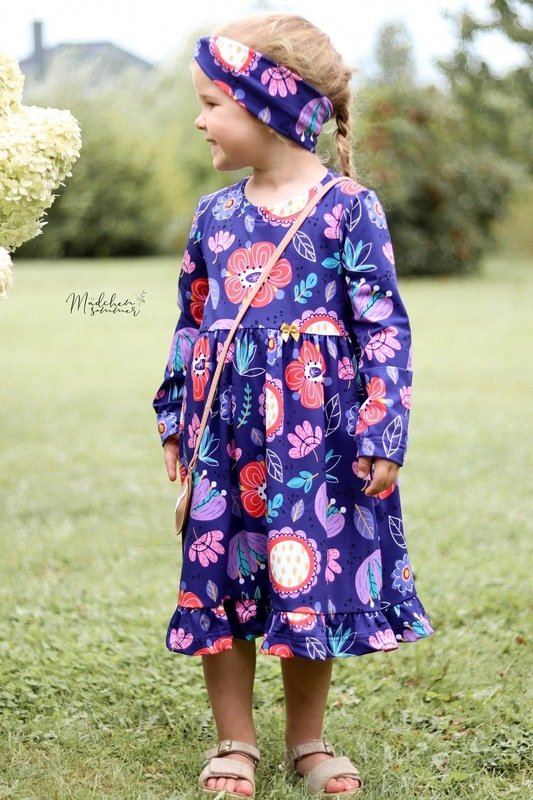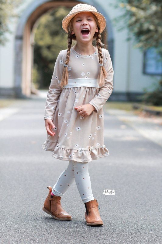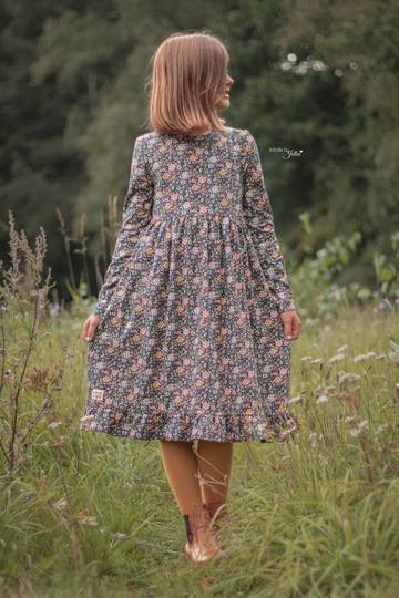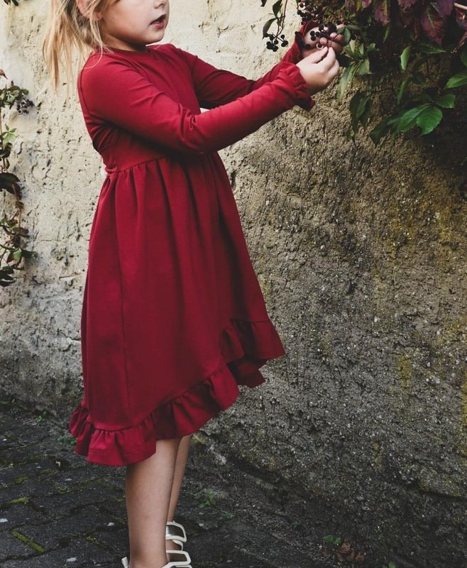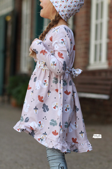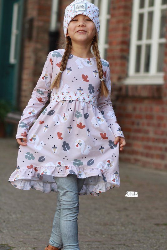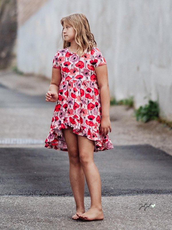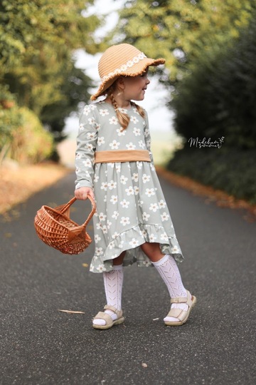 Der Halsausschnitt vom Basic Kleid wird mit einem Beleg oder mit Halsbündchen genäht. Bei den Ärmeln kannst Du zwischen langen oder kurzen Ärmeln wählen, die langen Ärmel können wahlweise gesäumt oder als verspielte Rüschenärmel genäht werden. Das Rockteil steht in einer normalen Variante oder als Vokuhila Version zur Verfügung.