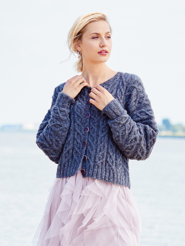 Auffallend in dieser Wintersaison sind nicht nur markante Zopfmuster, sondern auch neue Schnitte. Hier ein Modell in großzügiger Kimonoform, die durch Rippenbündchen an Saum und Ärmeln sowie der Halsausschnittblende eingefasst wird. Die Jacke wird in einem Stück samt Ärmeln über die Schultern hinweg gestrickt. Die Zopfstreifen, unterbrochen von glatt links, sehen schwieriger aus als sie sind, sodass du dir das Muster schnell eingeprägen kannst. Das verwendete Alpaka-Baumwolle-Schurwolle-Mischgarn macht daraus ein Ganzjahresmodell, das du lieben wirst. Eine Anleitung gibt es für die Größen 38/40 und 44/46.