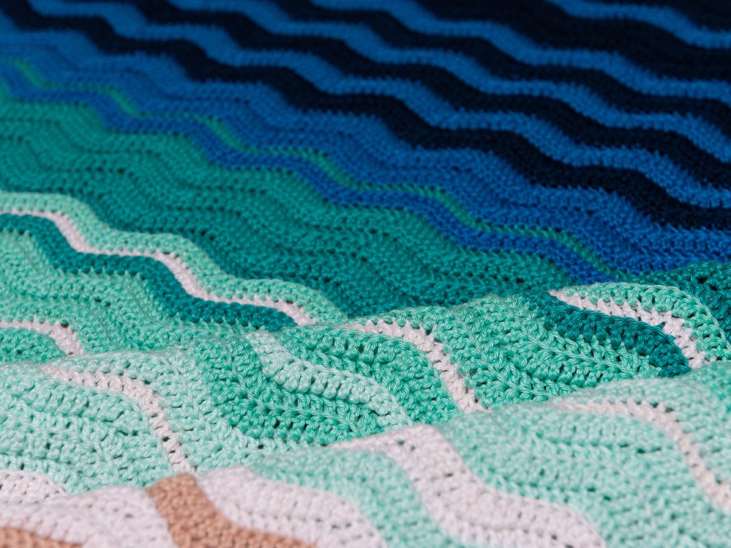 Mit dem Wellenförmigen Muster erinnert die Decke an das sanfte Rauschen des Meeres. Der Farbverlauf dieser Decke entführt uns gedanklich an einen weißen Strand mit warmen Korallensand, der zwischen unseren Zehen kitzelt. Das kühle kristallklare Wasser verläuft nach und nach in ein erfrischendes türkisblaues Wasser und mündet schließlich in der Ferne in das tiefblaue Meer, in dem das Sonnenlicht reflektiert. Die weise Schaumkronen verzieren den gleichmäßigen Wellengang.